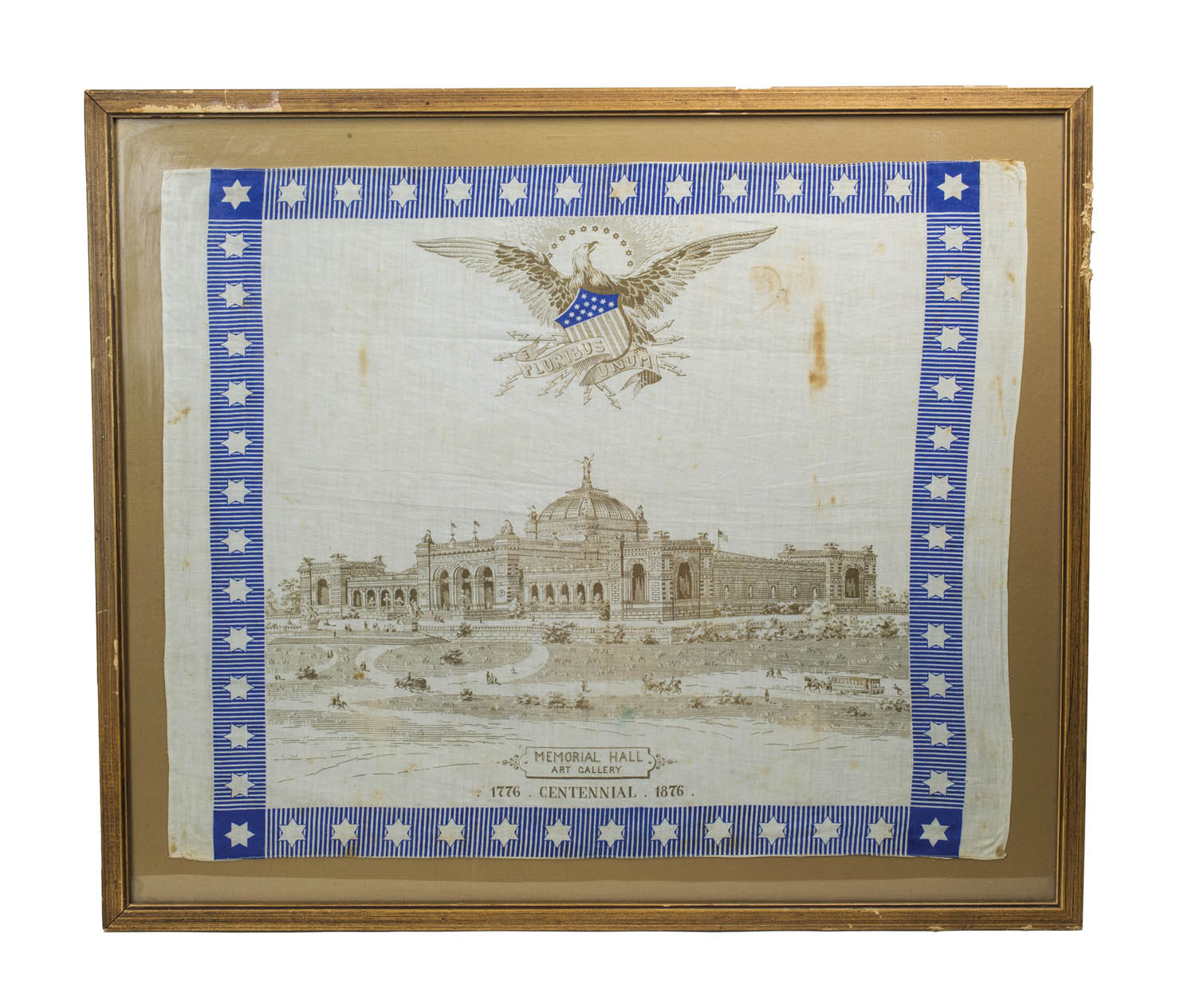 Cotton handkerchief, framed under glass, printed “Memorial Hall Art Gallery” below spread wing eagle, with star and stripe shield, “E Pluribus Unum”, “1776 Centennial 1876″, blue border with six point white stars, and blue stripes, visible stains, 20″ x 24″ (sight), 24 1/2″ x 29” (frame).
