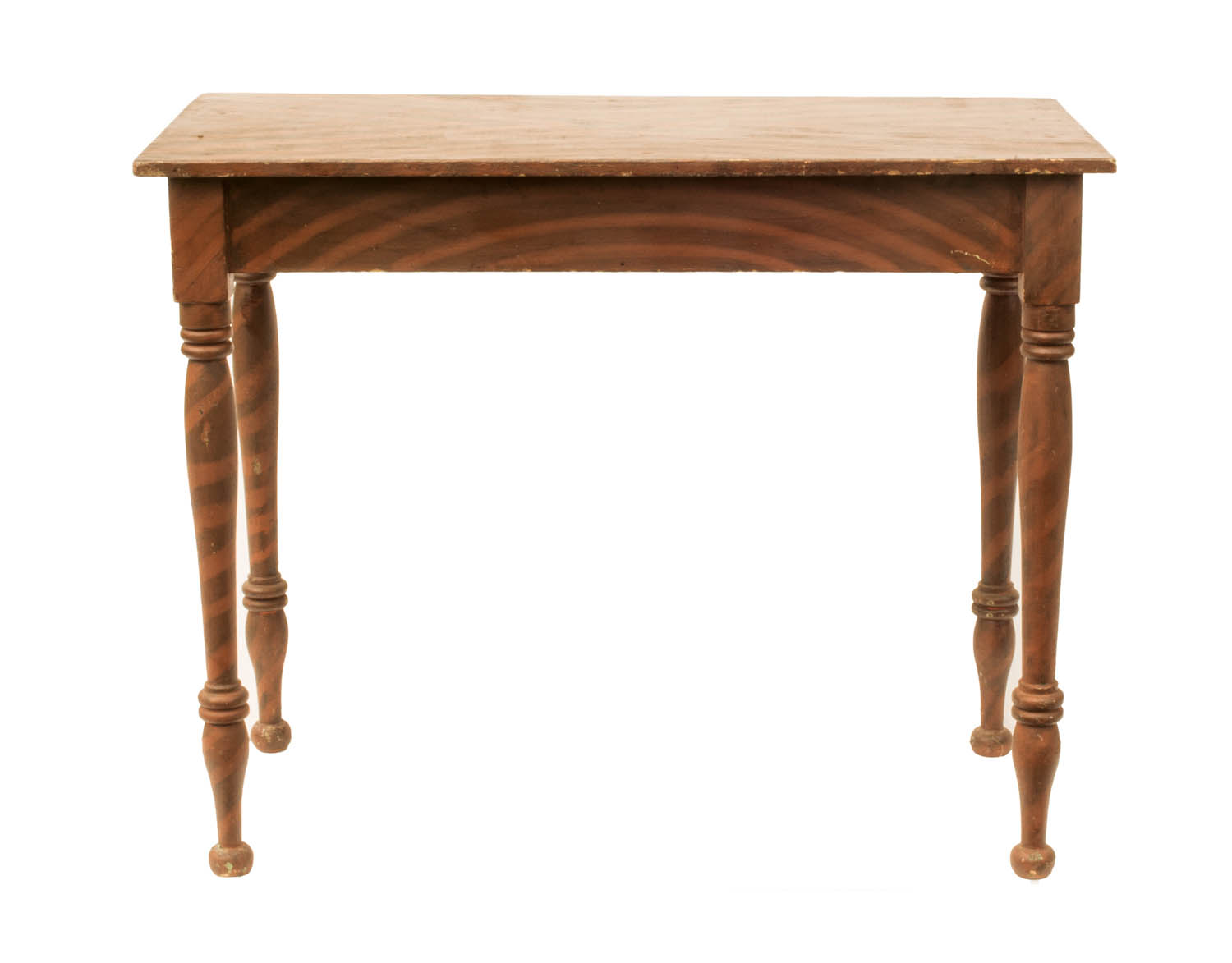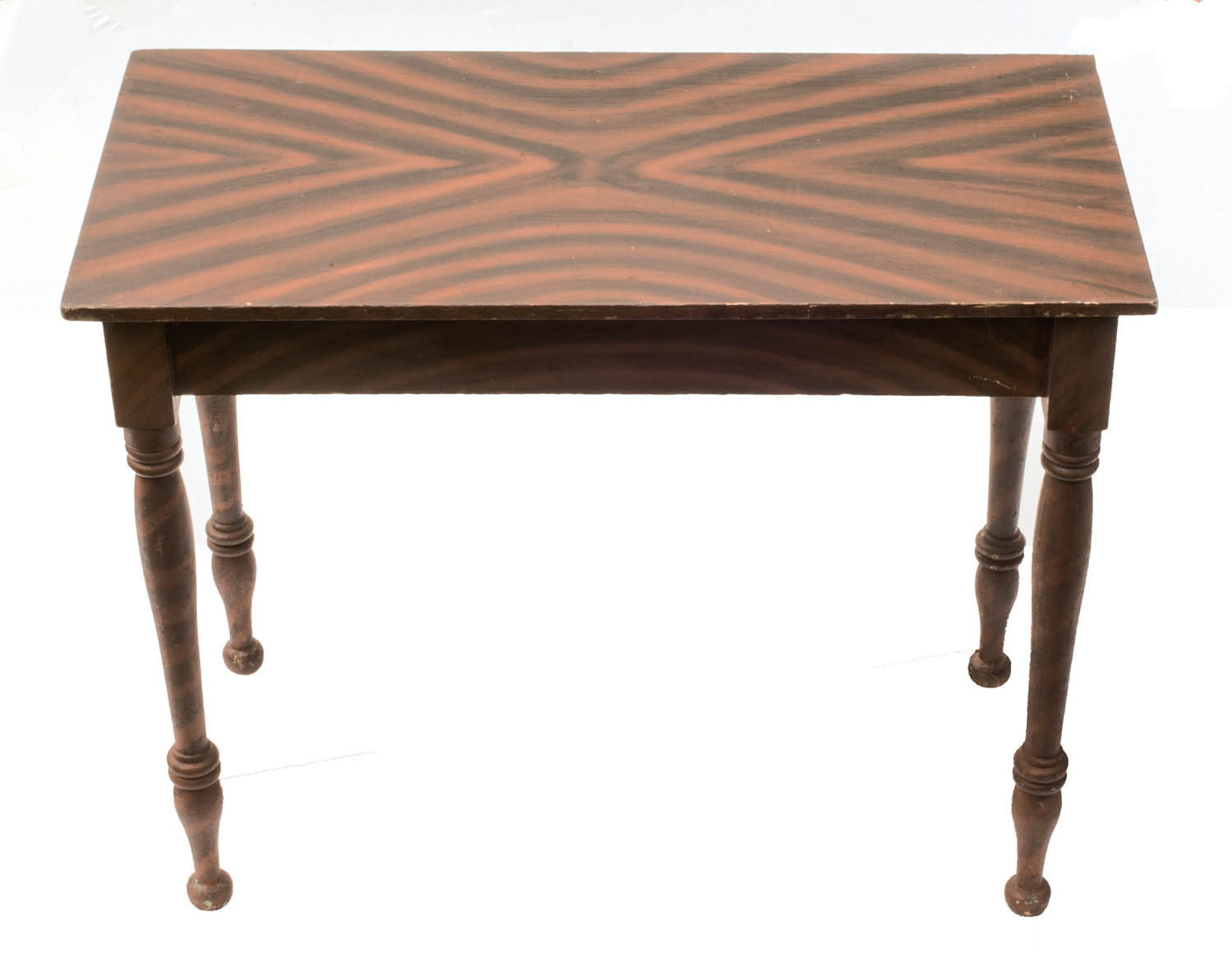 Pine, red with black geometric hand-brushed designs, (note: first coats were green and orange), signed in pencil script on underside of top “J. Kinsman”, turned legs, button feet, possibly Maine origin, 28 1/2″ h, 36″ w, 17 1/2″ d.