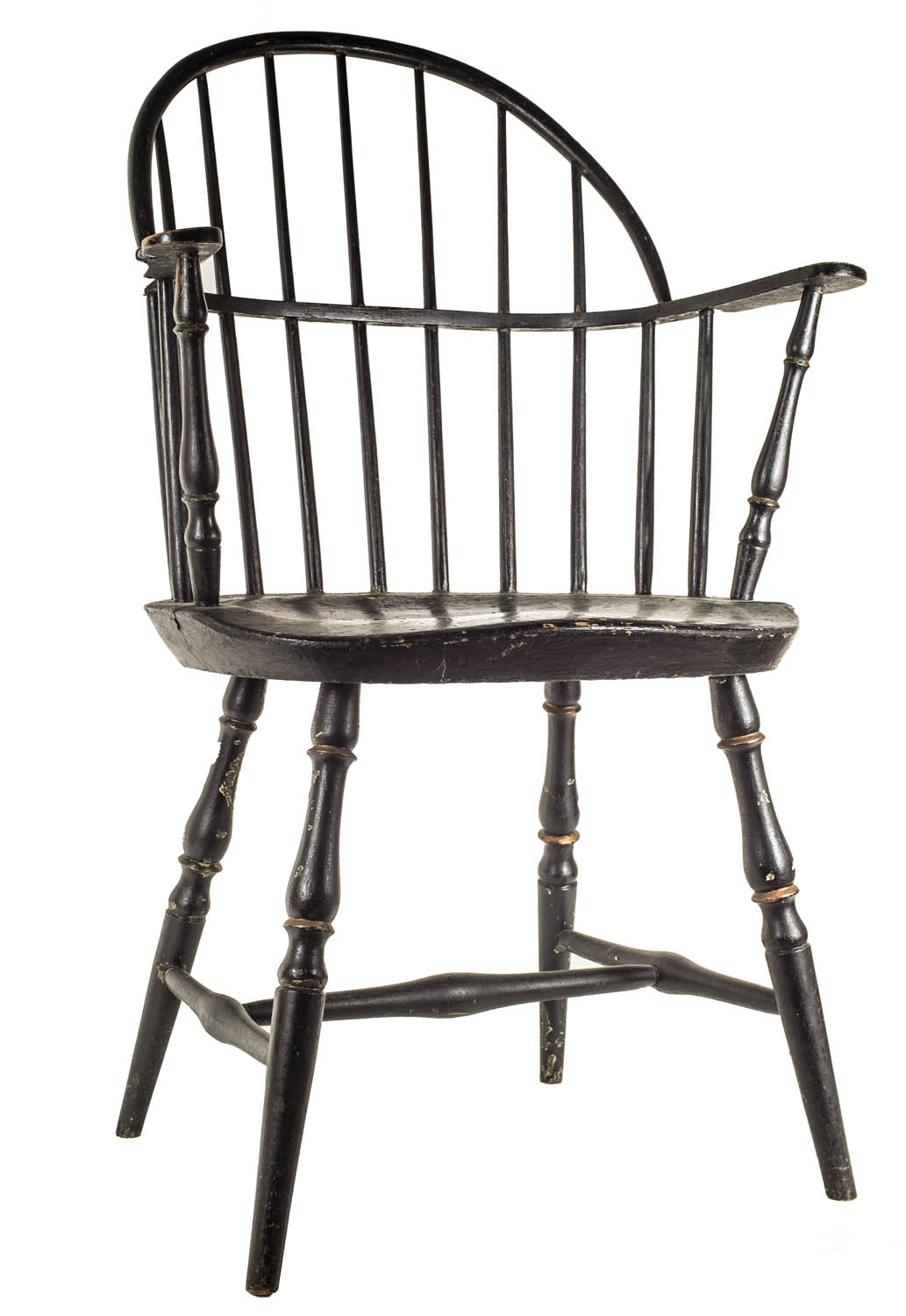 New England, bowback Windsor armchair, Victorian, black with gold highlights over original Windsor green painted finish, vase and ring turnings, “H” stretcher, 17 1/2″ seat h, 37 1/2″ overall h.