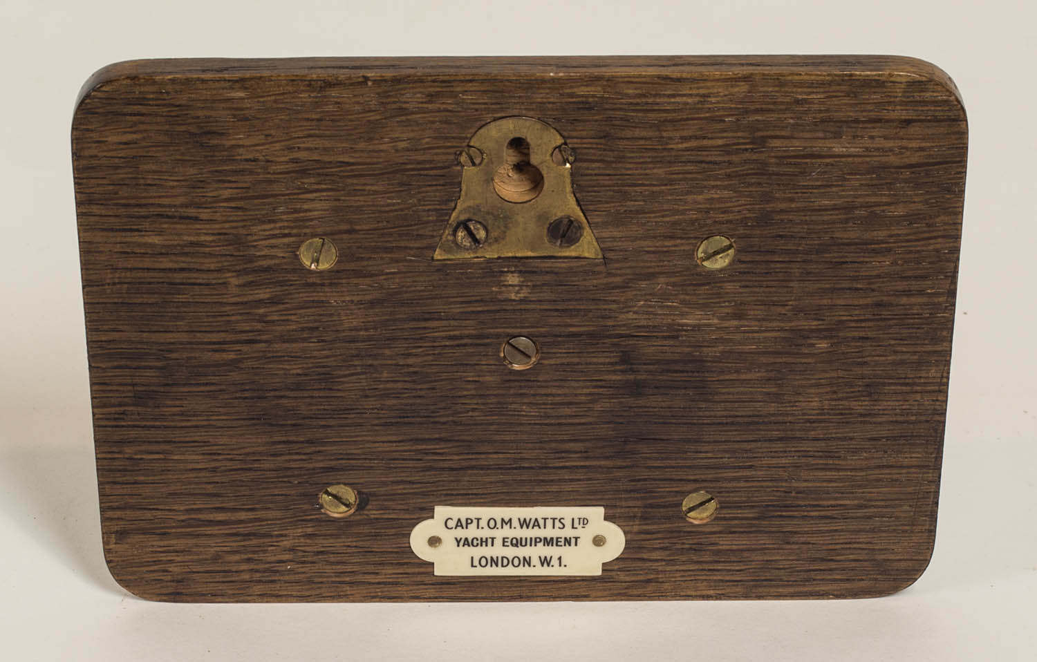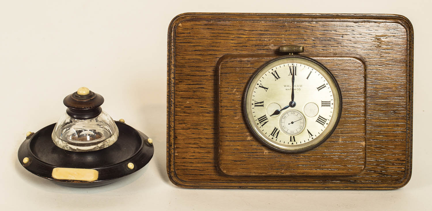 Waltham deck watch, mounted on an oak case and backboard with brass fittings for hanging, labeled on back “Capt O.M. Watts, Ltd. Yacht Equipment, London. W.1.”, silver dial with black Roman numerals, 3″ dia, 7 3/4″ x 5 1/2″ back; Cut glass and ebony inkwell with bone bead inlay decoration, a wood lid with whalebone ball finial, 3″ h, 4 1/2″ dia, (ex. estate of Justin Cobb).