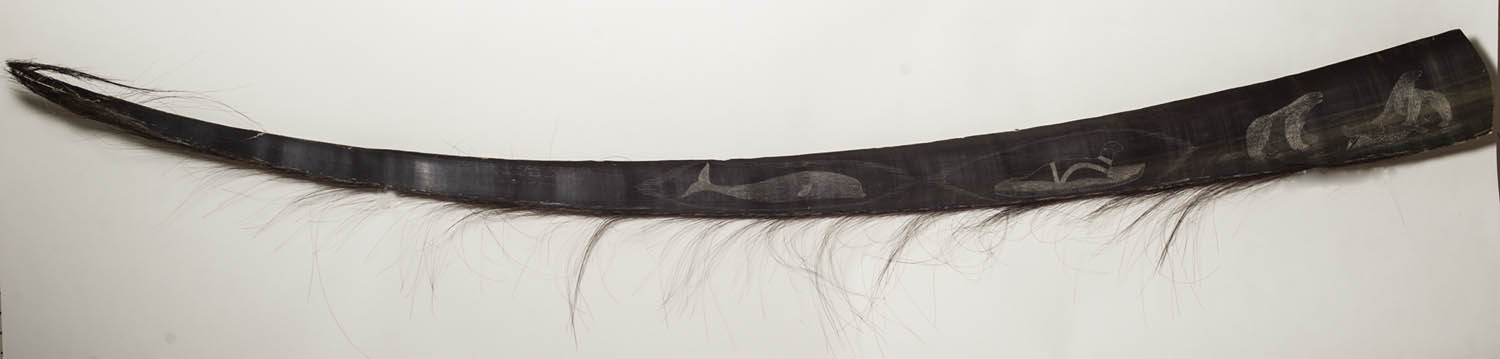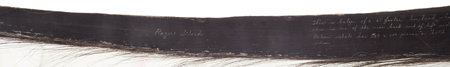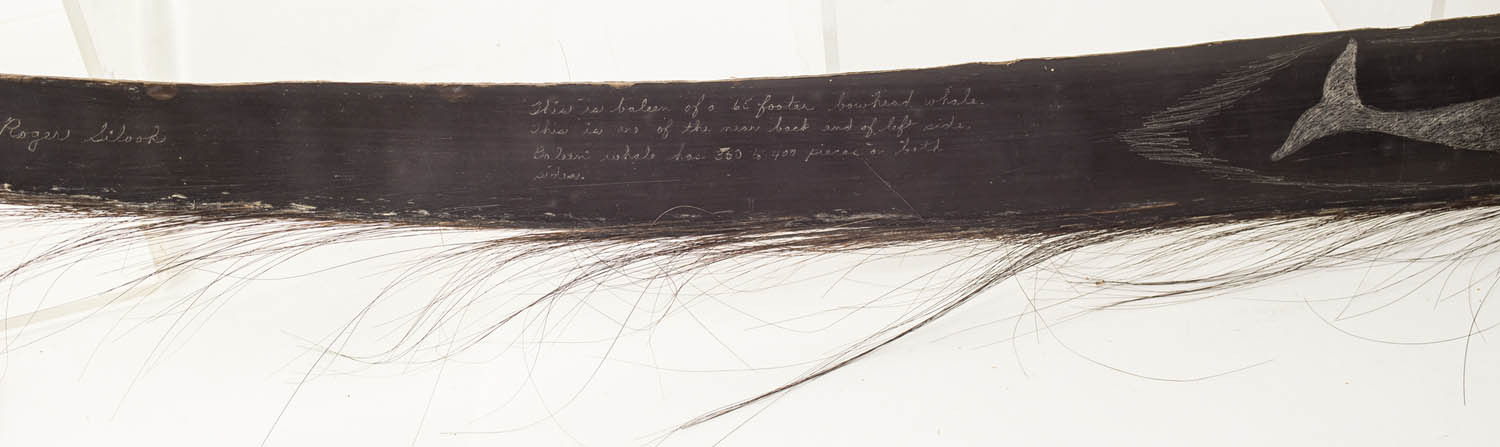 Piece of whale’s baleen with etching, “This is Baleen of a 65 Footer Bowhead whale, This is one of the near back end of left side, Baleen whale has 300 to 400 pieces on both sides”, signed “Roger Silook”, picturing a Bowhead whale, seals and two polar bears, labeled “authentic Native Handicraft of Alaska”, Roger Silook Gambell, July 10, 1975, 6′ 2″ l, (ex. estate of Justin Cobb).