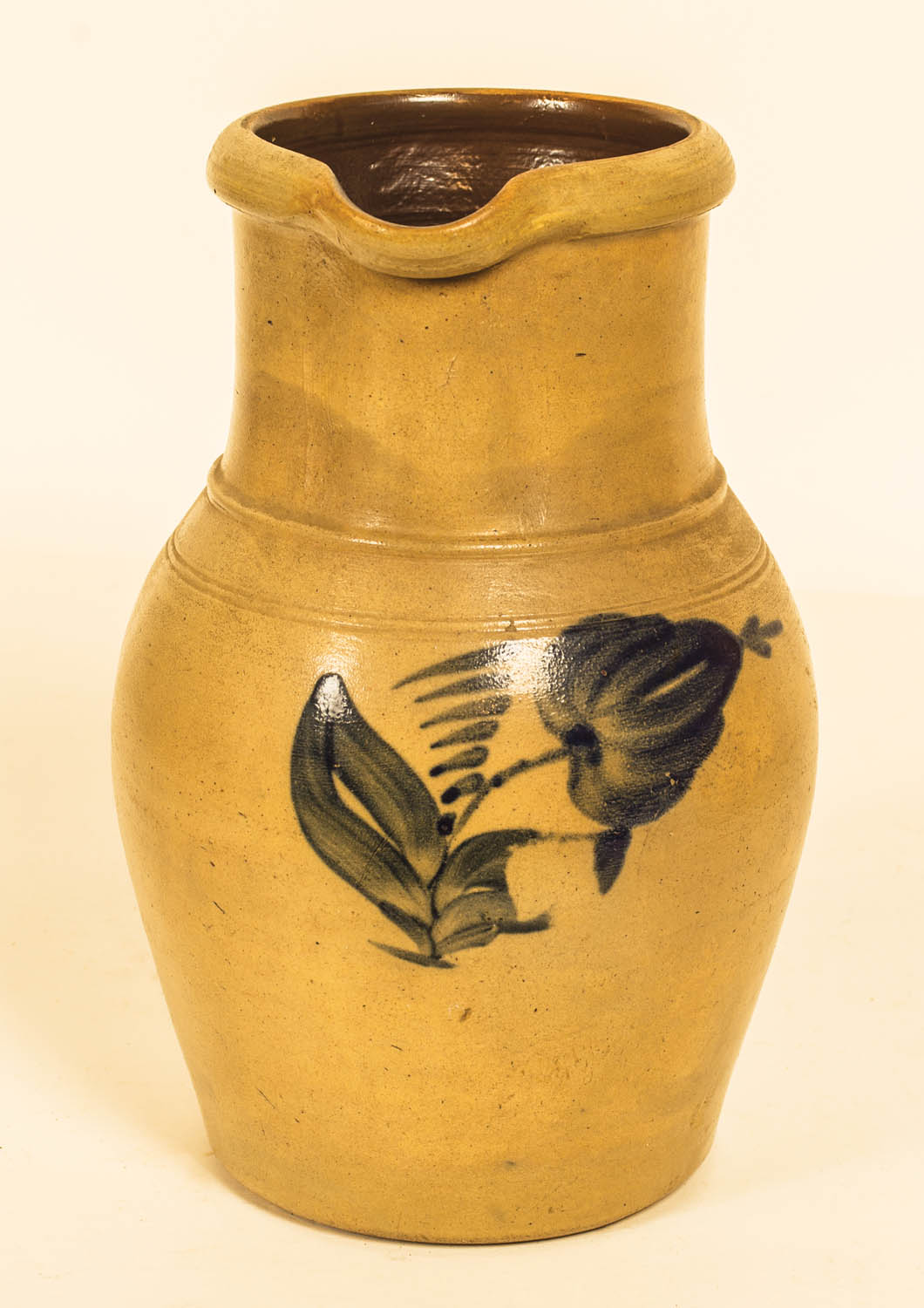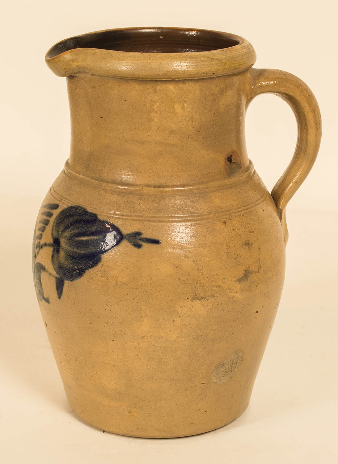 With flower and leaves, brown glazed interior, small chip near handle, 11″ h.