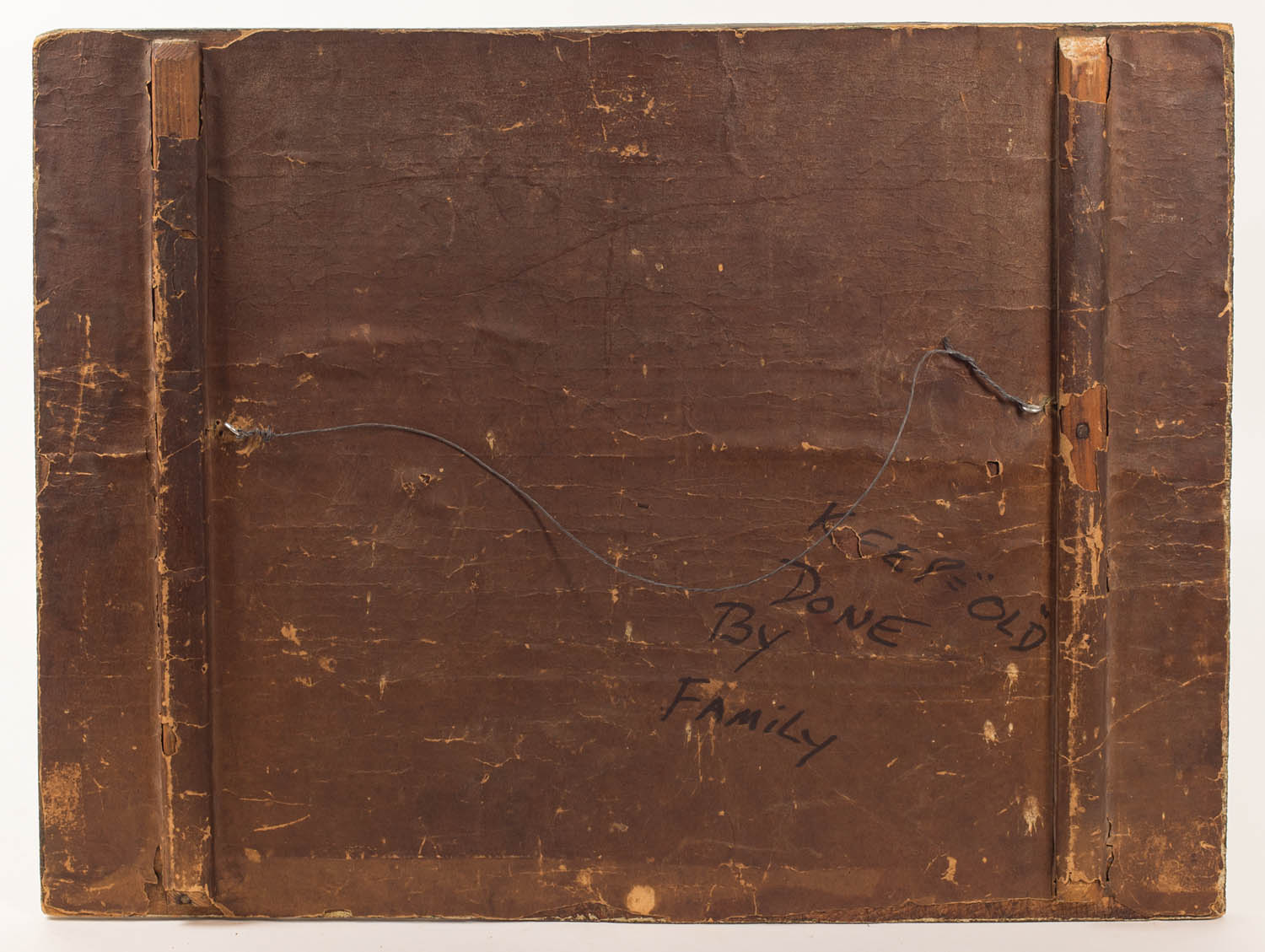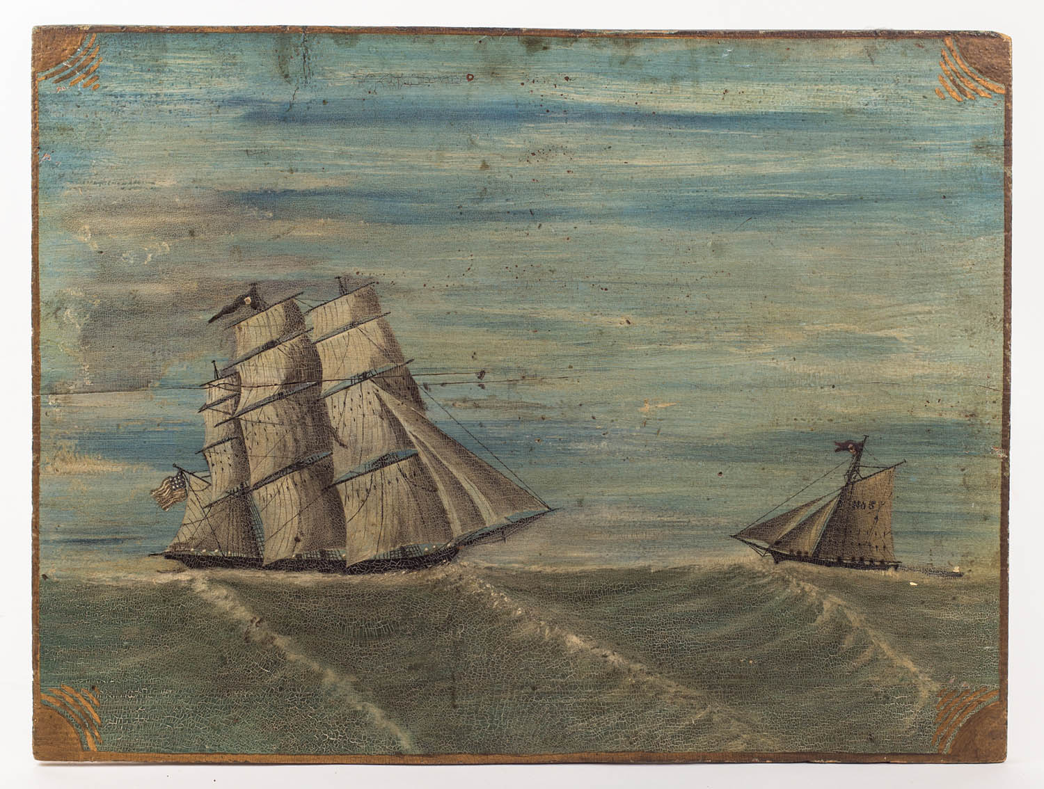 New England, pine, three-masted ship flying an American flag on the left, and another sailing vessel on the right, decorated triangular gilded corners to simulate a frame, cleated in the back with old paper cover, signed “painted by John Robinson” in pencil, and “Keep, Done by Family, Old” in marker as well, said to be from an estate in Putnam, CT, ex. Hollis Brodrick, crackle paint surface, single board 17 3/4″ x 23 1/2″.