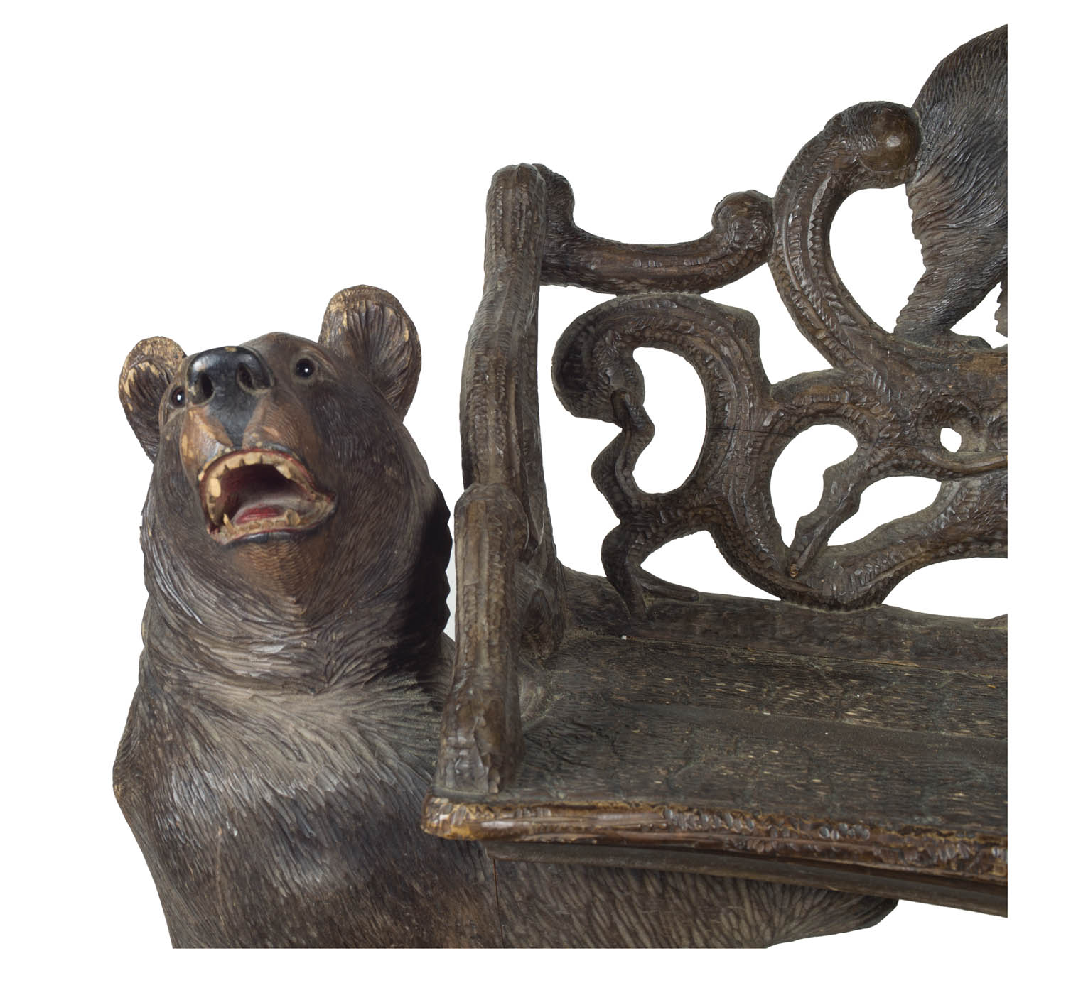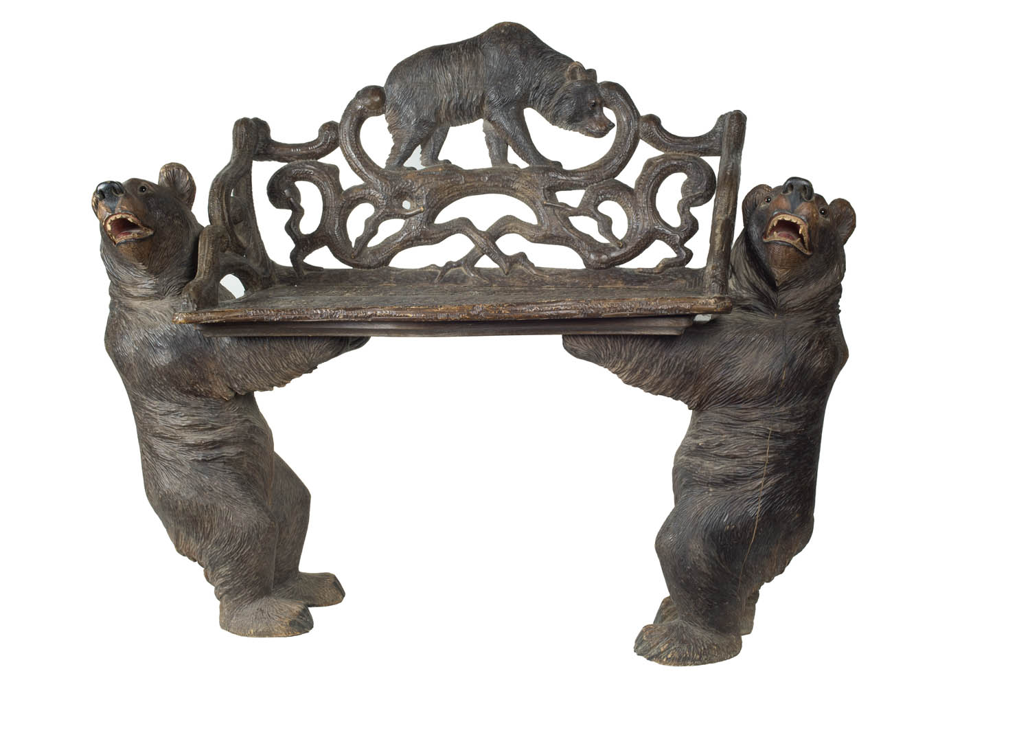 Walnut carved bear bench, purchased at the museum in Brienz, Switzerland in the 1960’s, two glass eyed bears supporting the bench, with a carved small bear in profile on back, good condition, 19 1/2″ seat h, 35 1/2″ overall h, 43″ w, 15″ d.