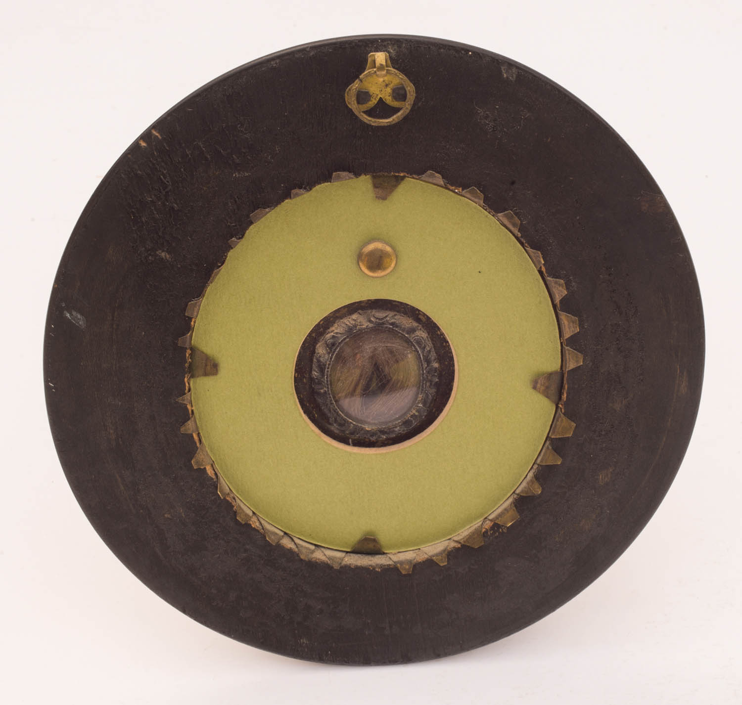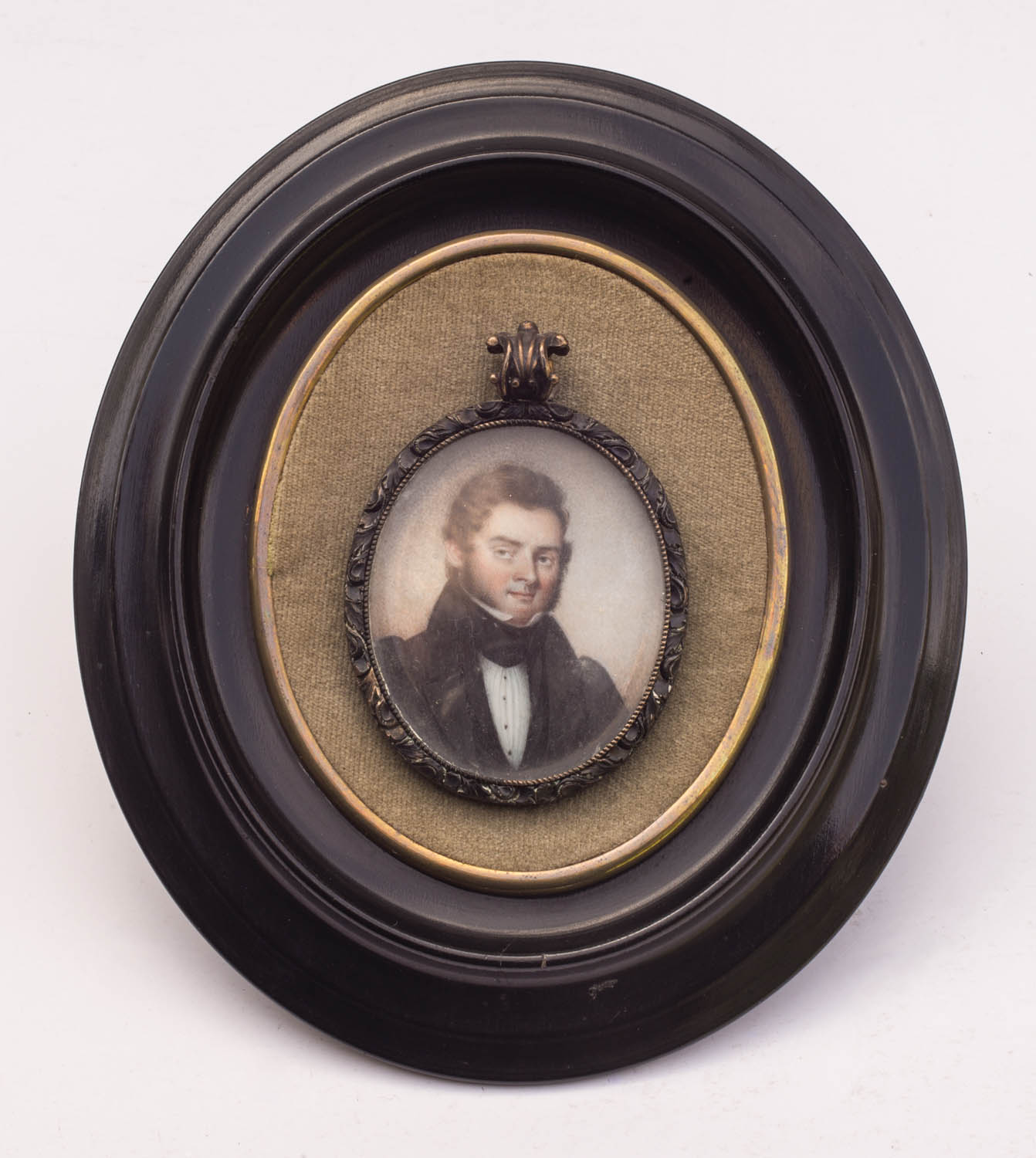 Watercolor portrait of a gentleman, in a black coat with side whiskers, in a metal frame with lock of hair in glass on reverse, 2 1/2″ h, 6″ h (outside frame).