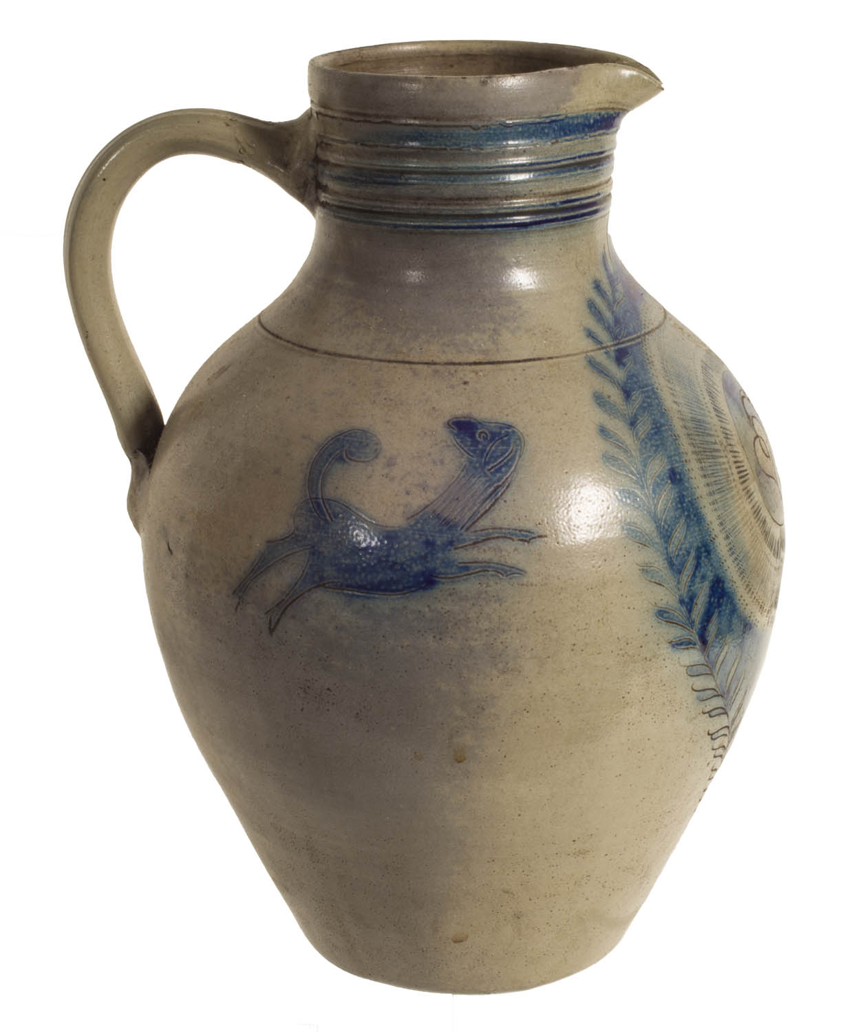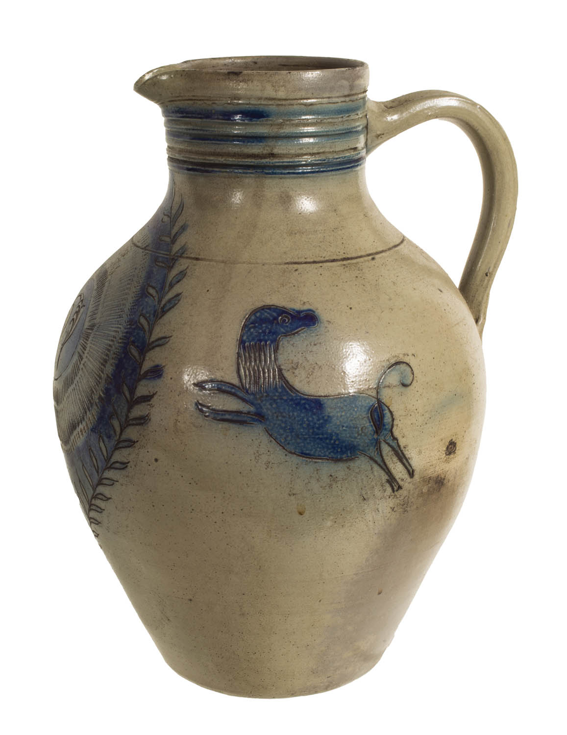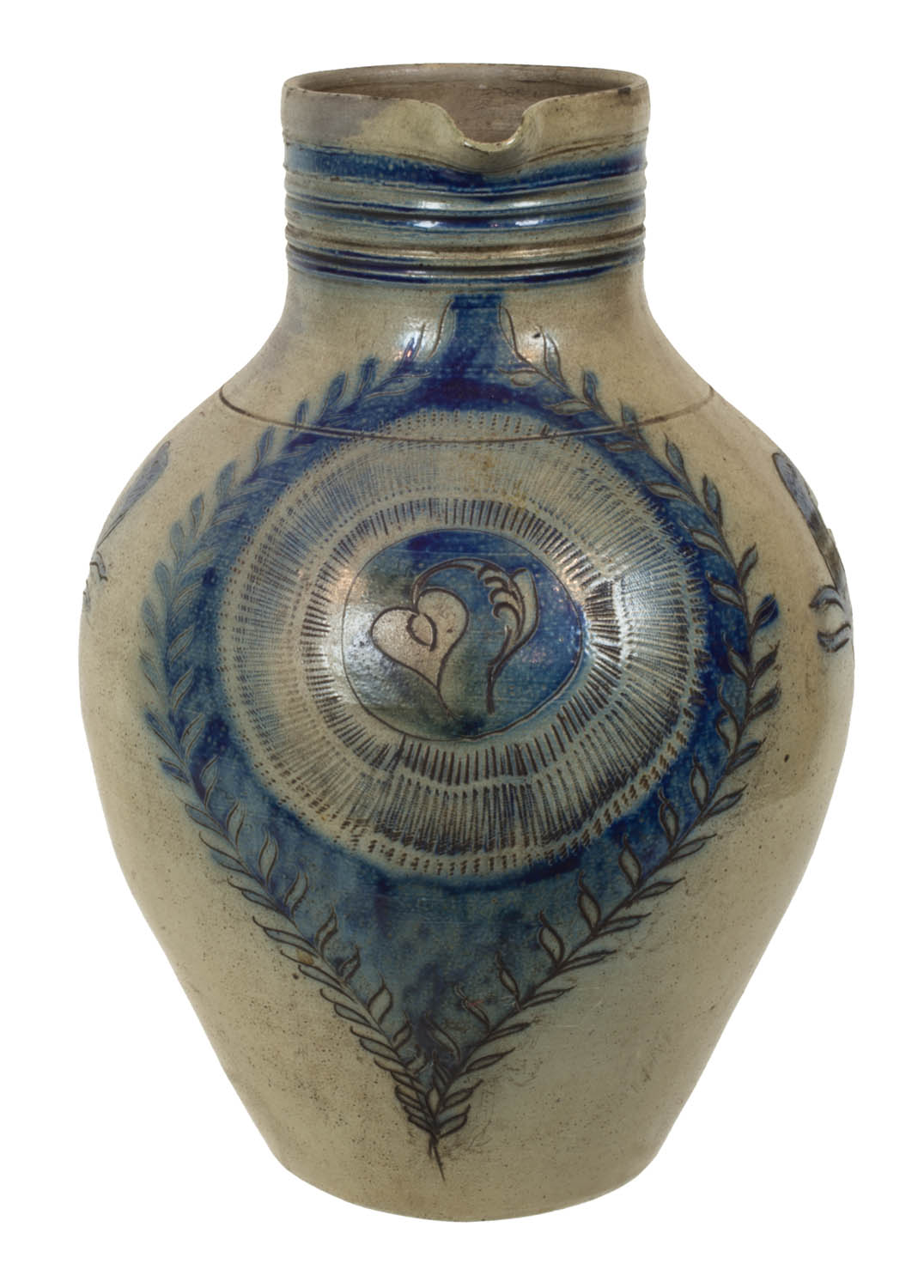 Large stoneware decorated pitcher, with tall decorated neck, incised heart and flower on front, surrounded by a blue incised wreath, with incised blue decoration, running dogs on the sides, floral motif on back below impressed handle, good condition, 13″ h.