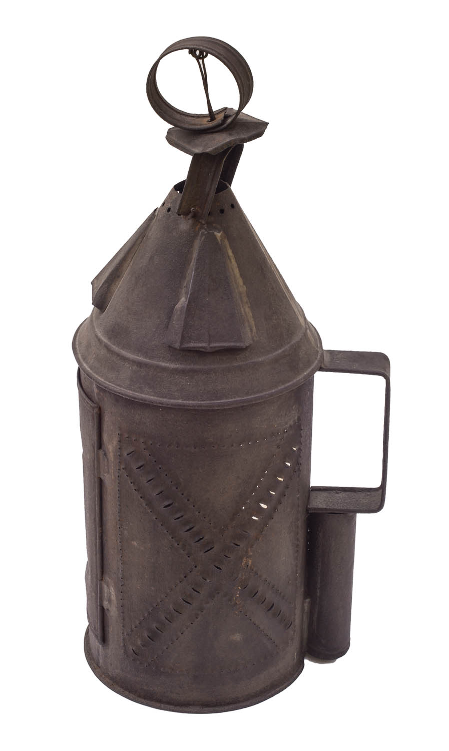 Lantern with inset isinglass door and sides, with handle and hanger on top, punch tin decoration, 15″ h, 6″ d.