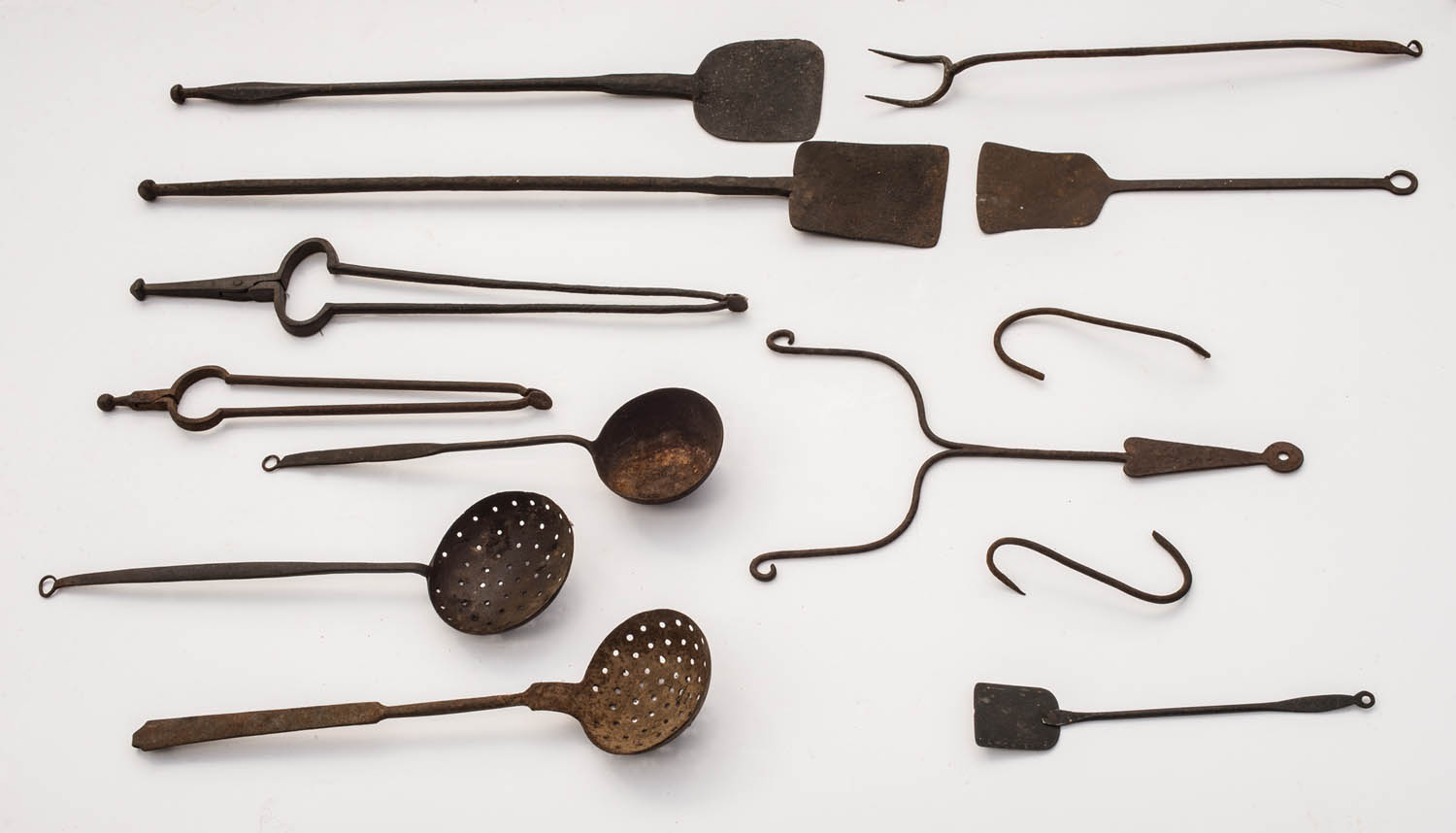 Collection of 18th and 19th c., New England, wrought and cast iron fireplace utensils, including peels, tongs (including Shaker), strainers, fork, spatula, hooks, approximately 12 pieces.