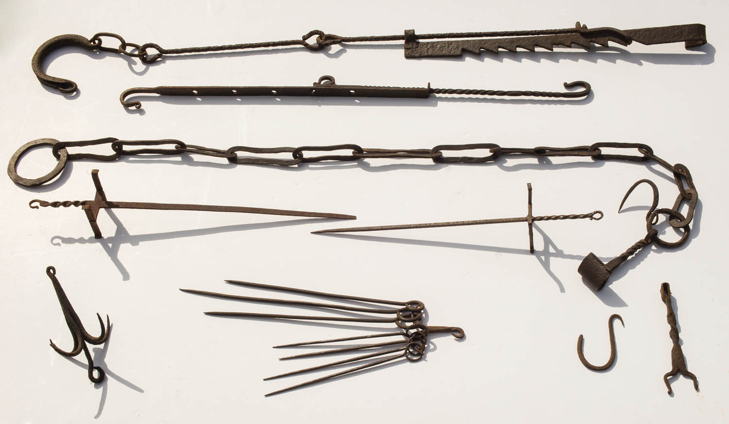 Collection of 18th and 19th c., New England, rare wrought iron trammel hooks, skewer set with hanger, hooks, etc.