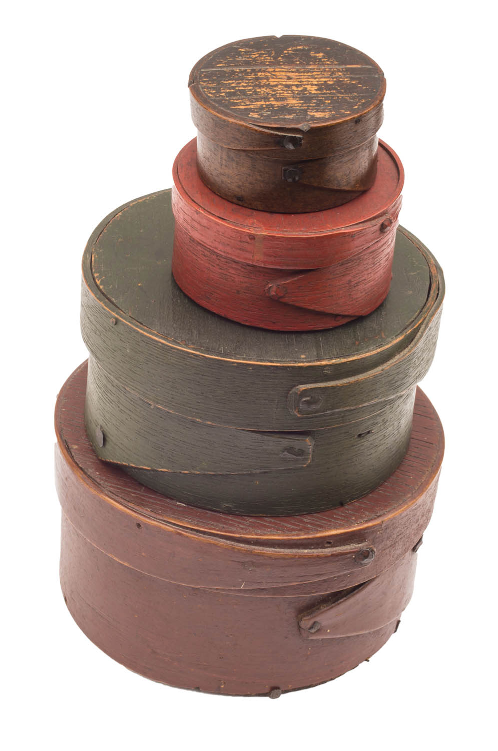Round boxes, maple and pine, in original brown stain, original red paint, original green paint, and original red/brown paint, all constructed with rosehead nails, 1 1/8″ h, 2 1/8″ dia to 2 1/4″ h, 5″ dia.