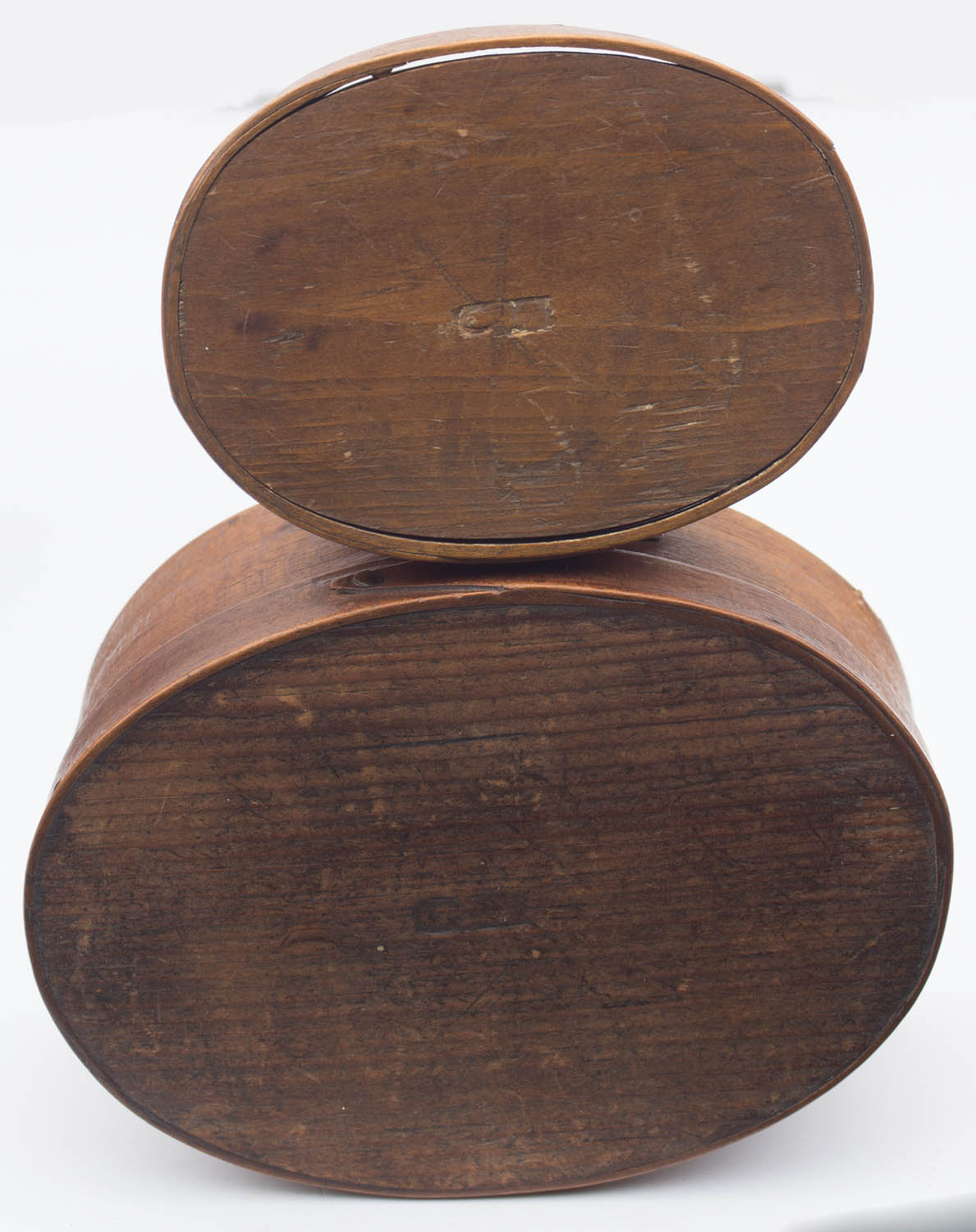 Maple and pine, natural finish, marked on lid “CH” (Cotton Hersey, 1792-1881), (note: old patina, small chip in lid caused by a wood rim peg), 2 3/4″ h, 6″ l; Maple and pine, natural finish, marked on lid “CH” (Cotton Hersey, 1792-1881), fine condition, 2 1/8″ h, 5 1/8″ l.