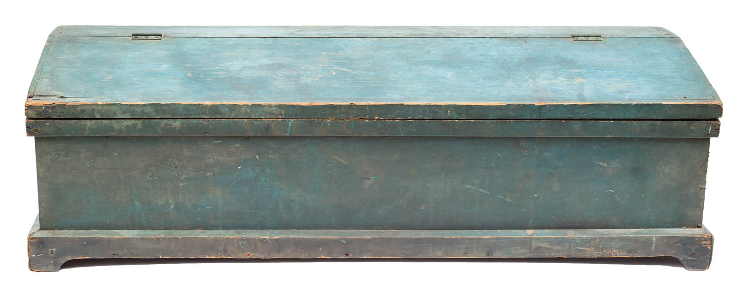 Pine, in original blue painted finish, with hinged slat lid and four sectional compartments, applied footed base. 9 1/2″ height (in front), 11 1/2″ length (in back), 37 ” width, 12 1/2″ depth.