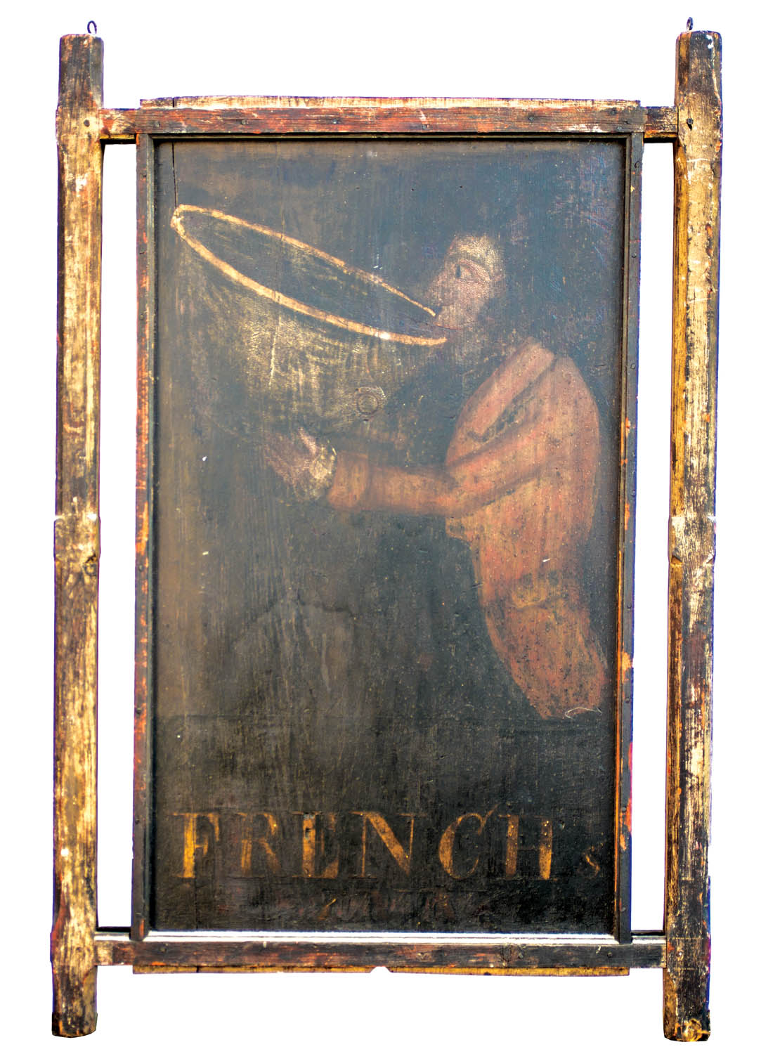 American, pine and red cedar sign, original paint, “French’s Inn”, depicting a barefoot man, orange coat, brown pants, walking with a large bowl on his back on the front side, the back shows same gent drinking from the bowl, (note: wonderful sign in as-found condition), 38″ x 22″ (sight), 48″ x 31 1/2″ (frame).