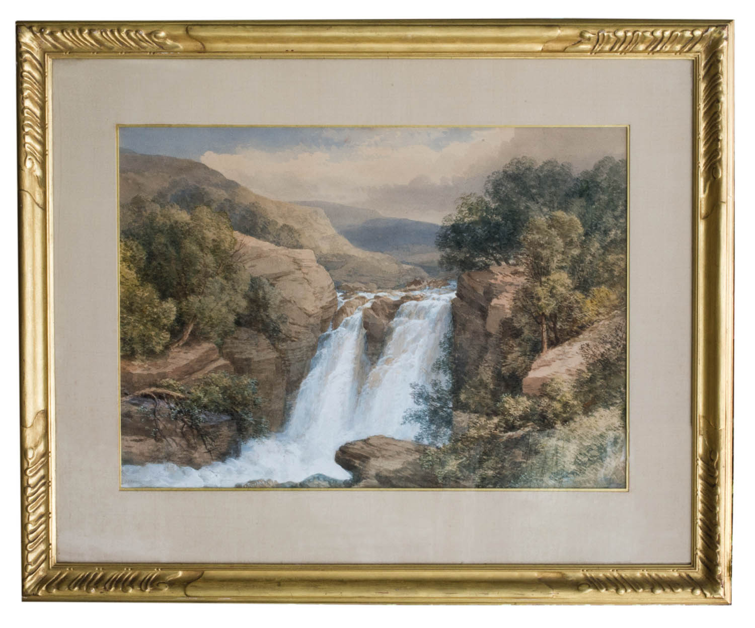 Waterfall in a rocky mountain landscape, L. Bartholme (?), tagged on back “Gale Forse Falls, England, Given to Robt. Casson by James J. Hill from his collection 1890″, 18″ x 25”.
