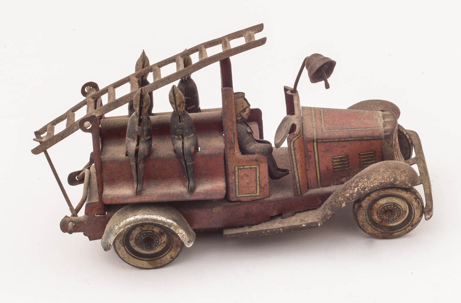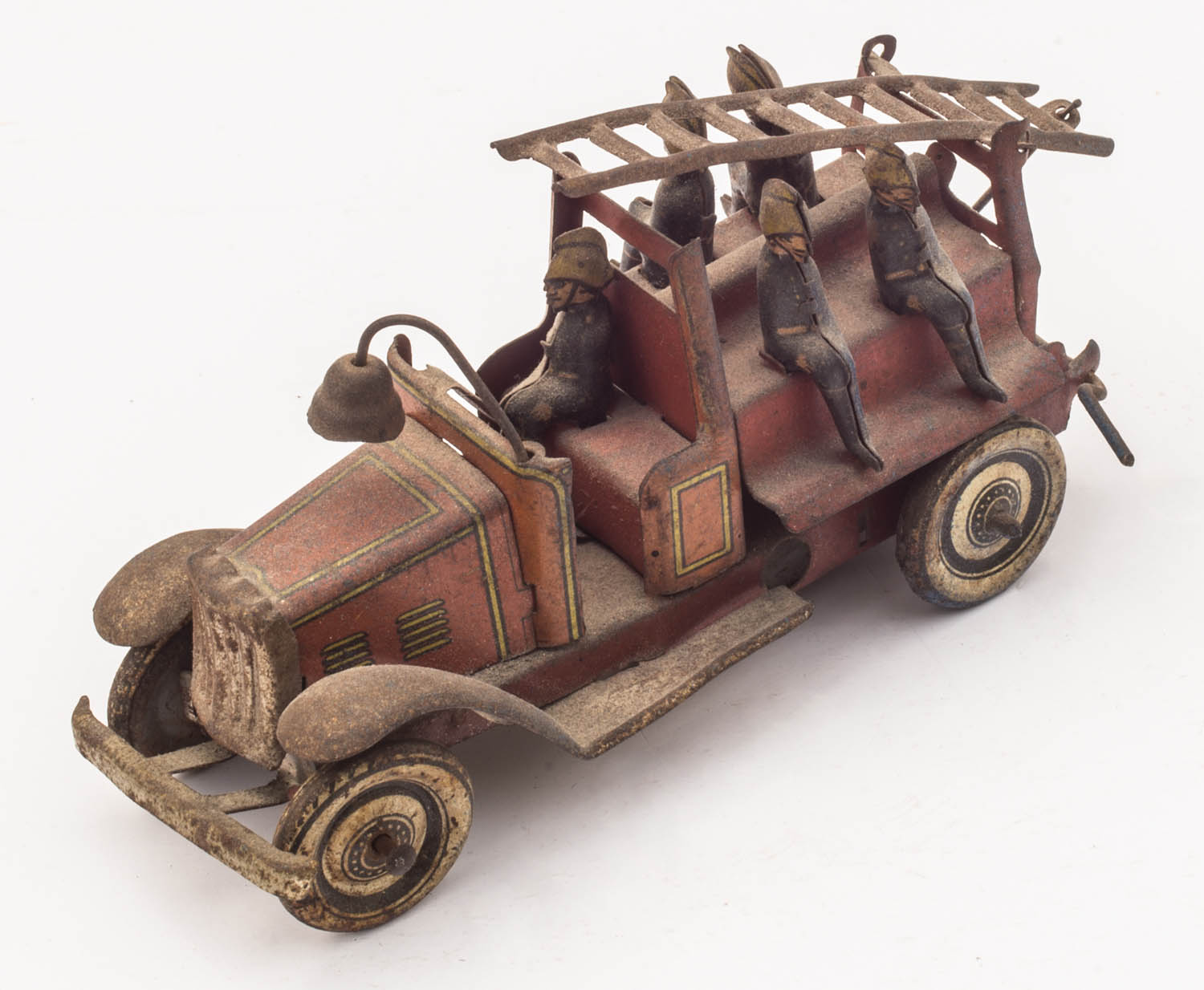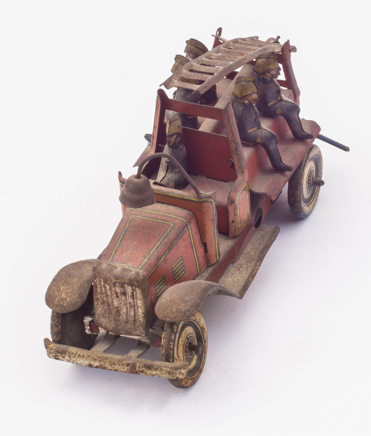 Toy truck with ladder and five firefighters, in original paint, 2 1/2″ h, 4″ l.