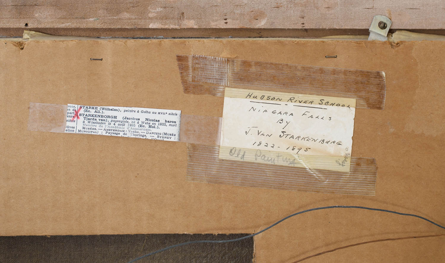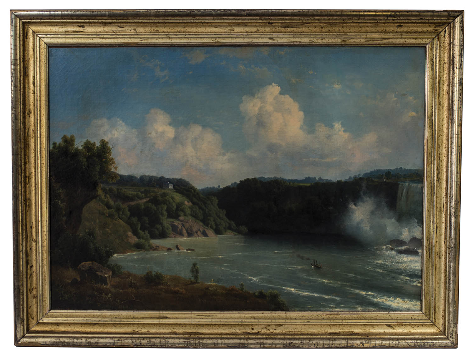 Oil on canvas, Niagara Falls, paddlewheel steamer, with finely done landscape, Hudson River School, Jacobus Starkenburgh (1822-1895), relined, gilded frame, 19″ x 26 3/4″.