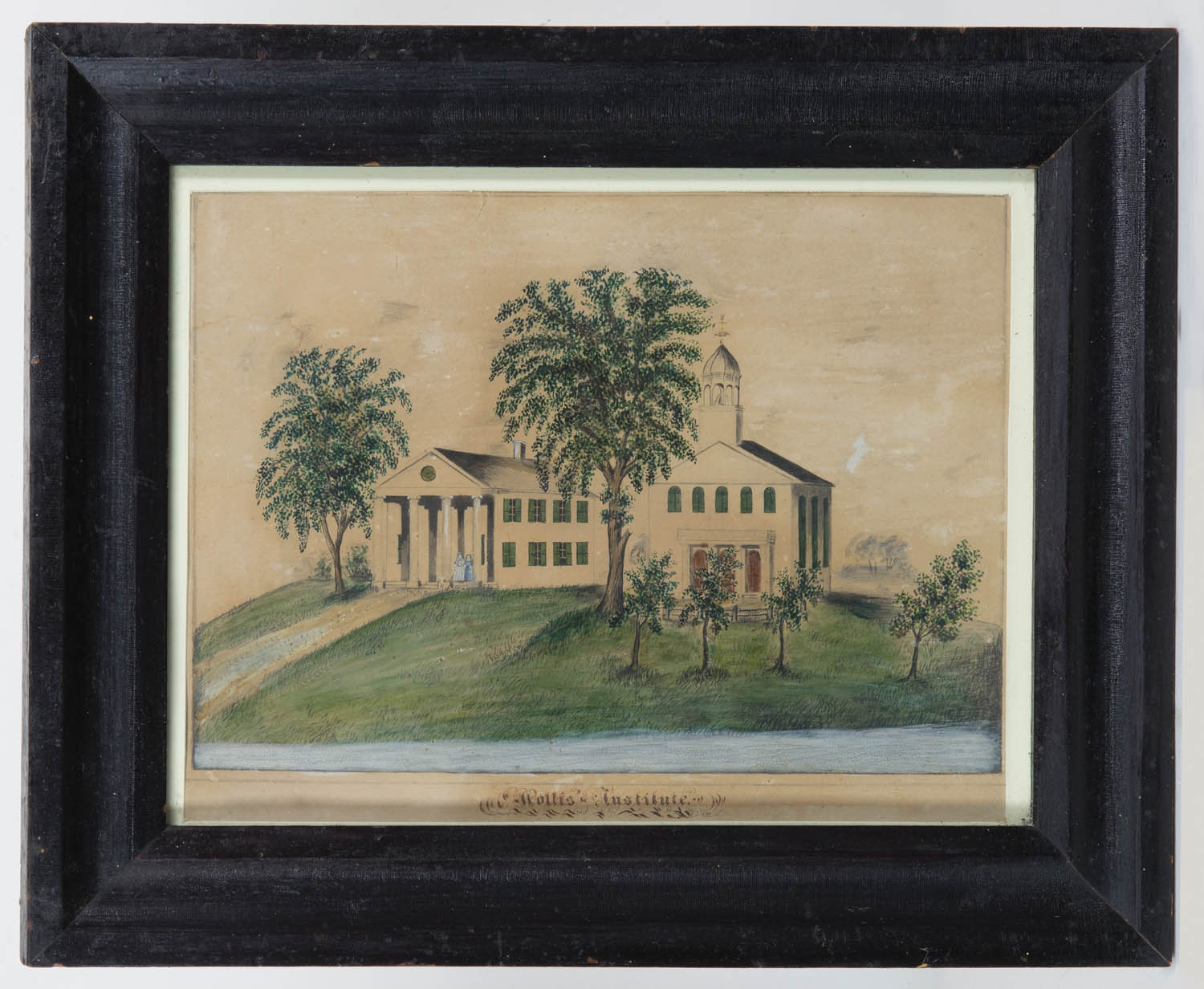 “Hollis Institute”, shows two young ladies standing between two Grecian columns, and a church with a gilded weathervane, signed in ink on reverse “Miss Kittridge, New Hampshire”, small tear at top left, some toning, 8″ x 11″ (sight).