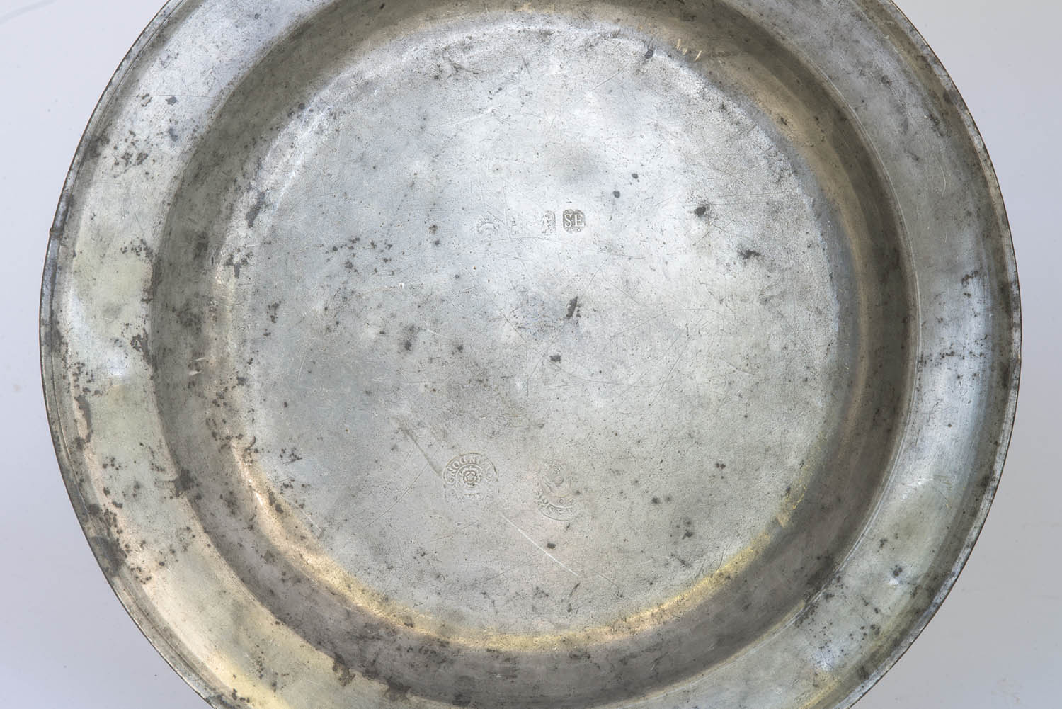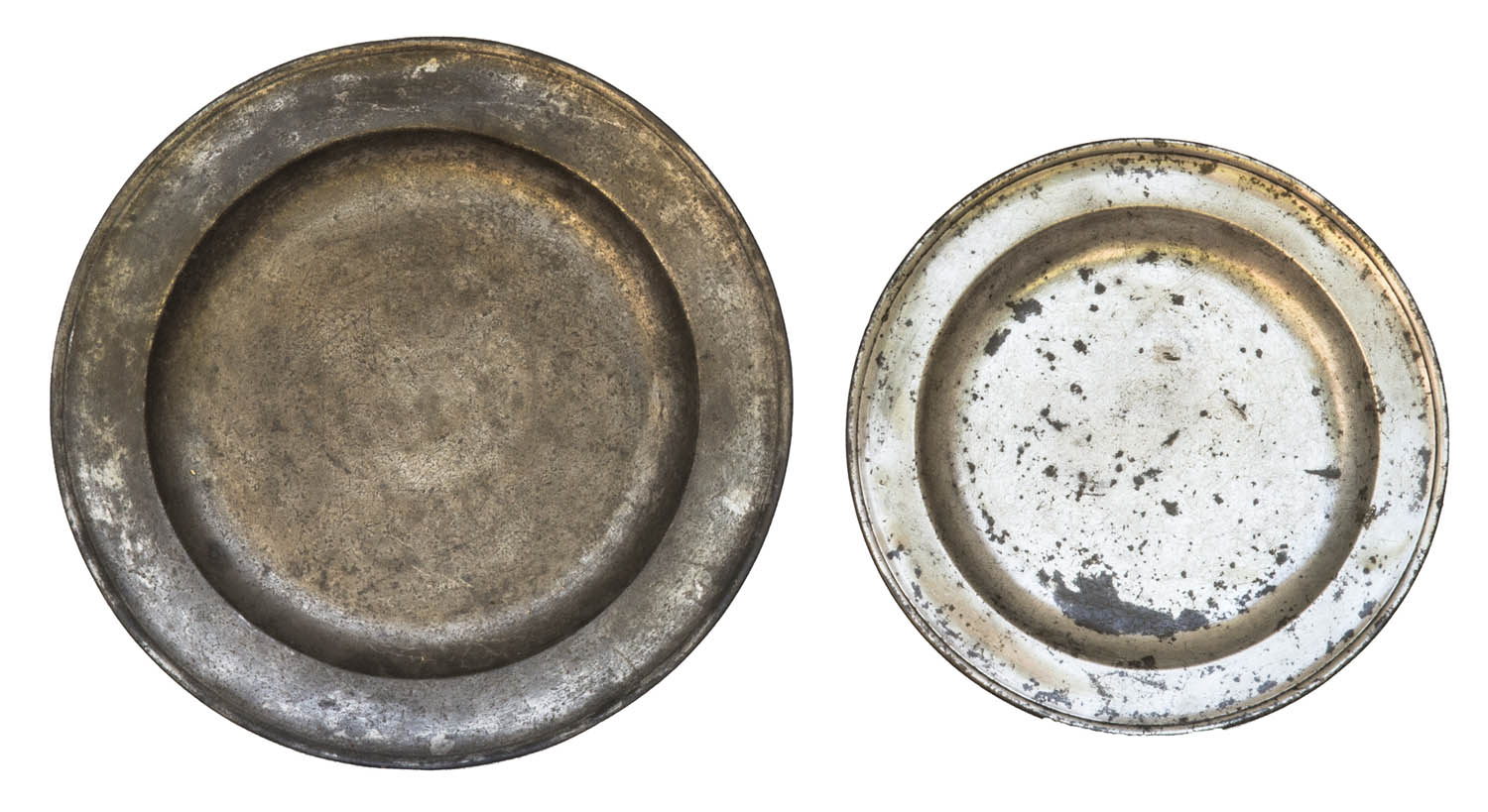 Two early pewter chargers, one marked “London”, 12″ and 15″ dia.