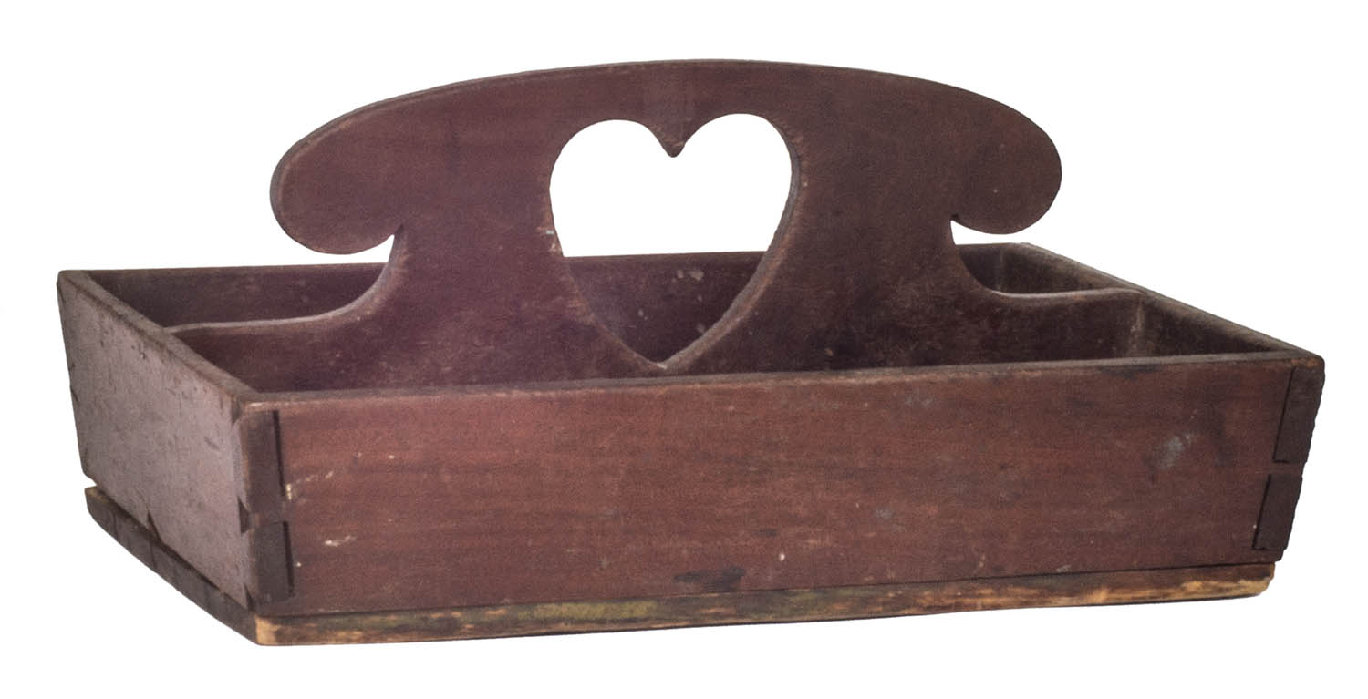 Mahogany, heart cutout handle, dovetailed construction, 5″ h, 12″ l.