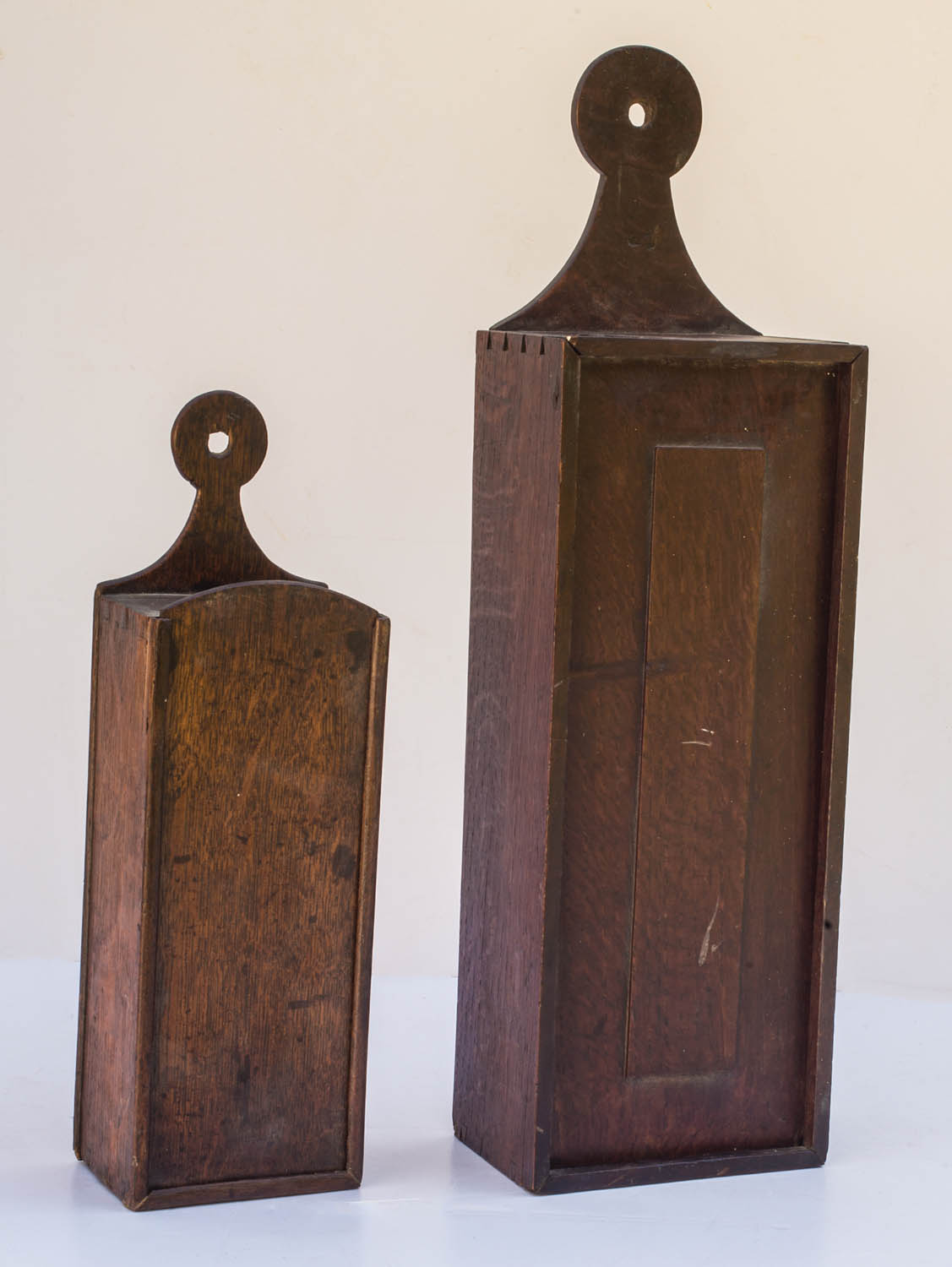 18th/early 19th c. oak hanging candle boxes, slide lids, lollipop-shaped extended back for hanging, larger box has raised rectangular panel on lid, great patinated finish, from an Albany, NY collection, 13 1/2″ and 20 1/2″ h.