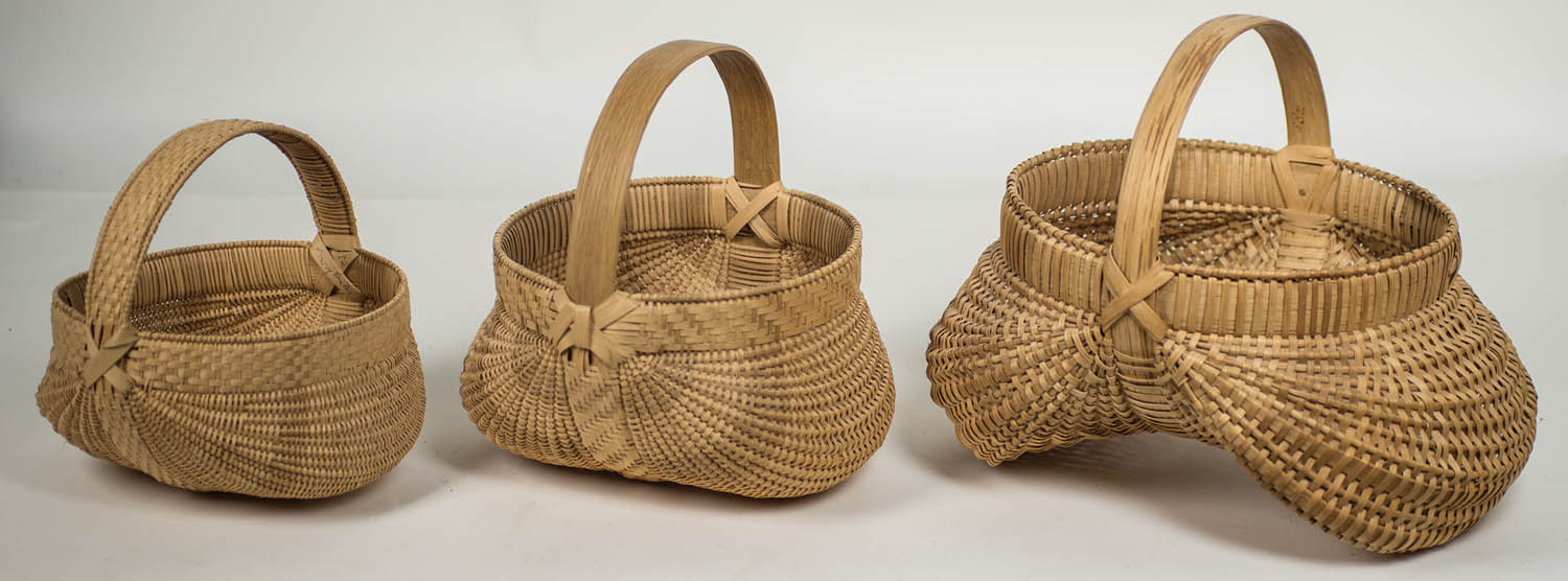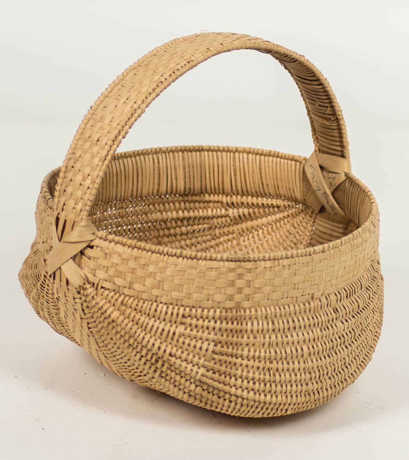 20th c. egg gathering baskets, one a Mary Procter basket, c. 1992, exceptional weaving including handle (signed), 4″ h (to rim), 7 1/2″ dia.