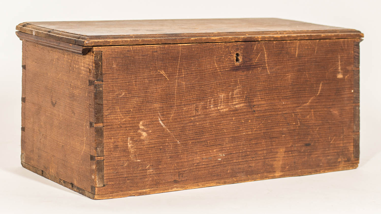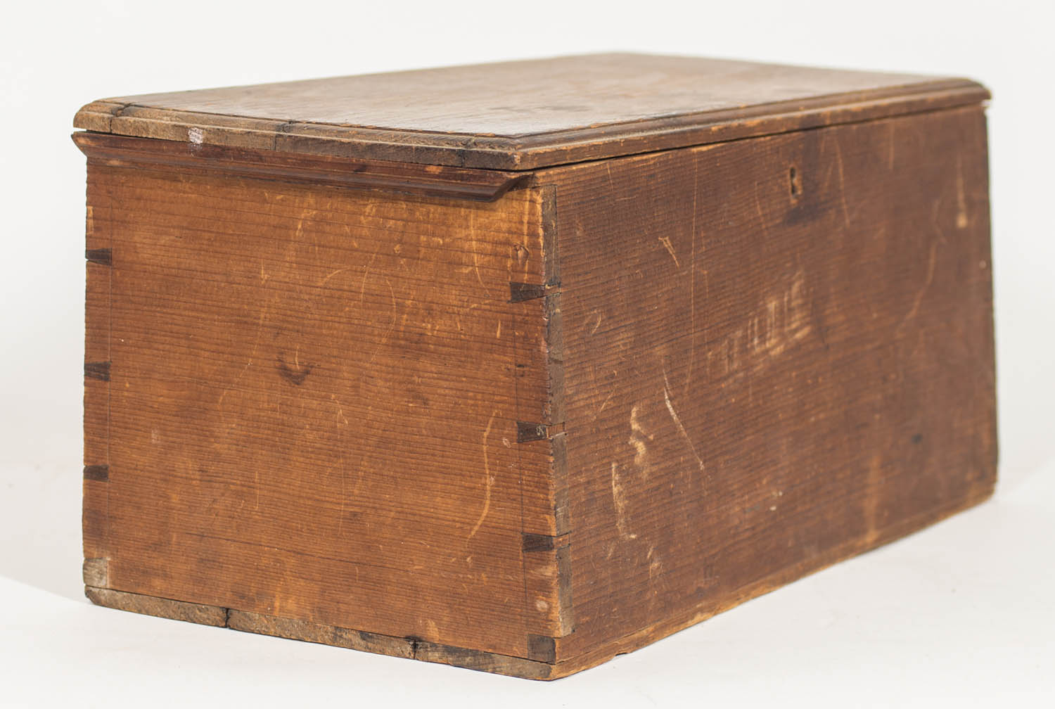 Pine, original patinated finish (never painted), finely molded lid, canted front, dovetailed construction, original brass hinges, c. 1830-1850, excellent condition, 6 1/2″ h, 14 3/4″ w, 6″ d.
