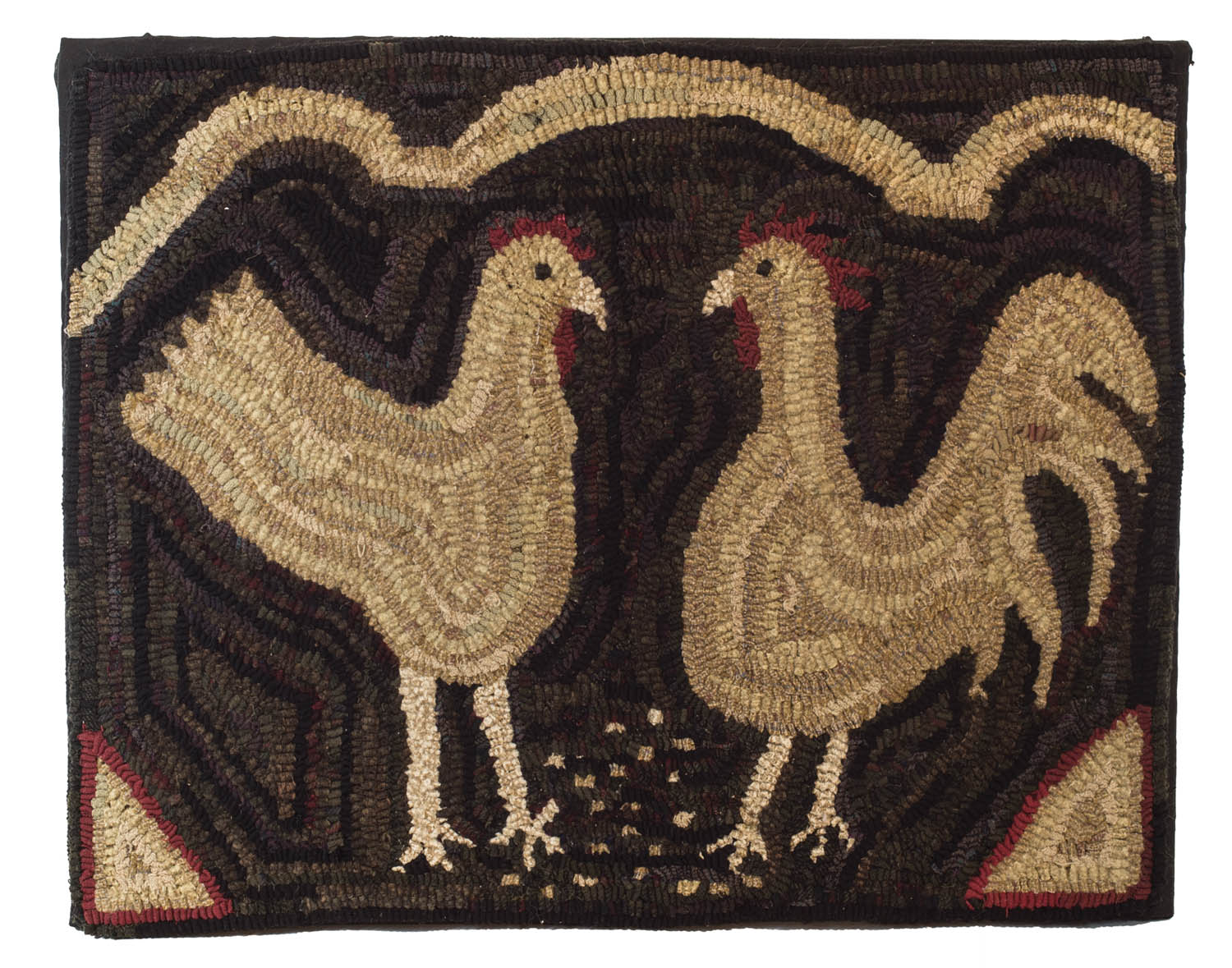 19th/early 20th c. rug, showing two chickens facing each other, on a mottled dark background, with seeds below, bottom corners outlined in red, mounted on a display frame.