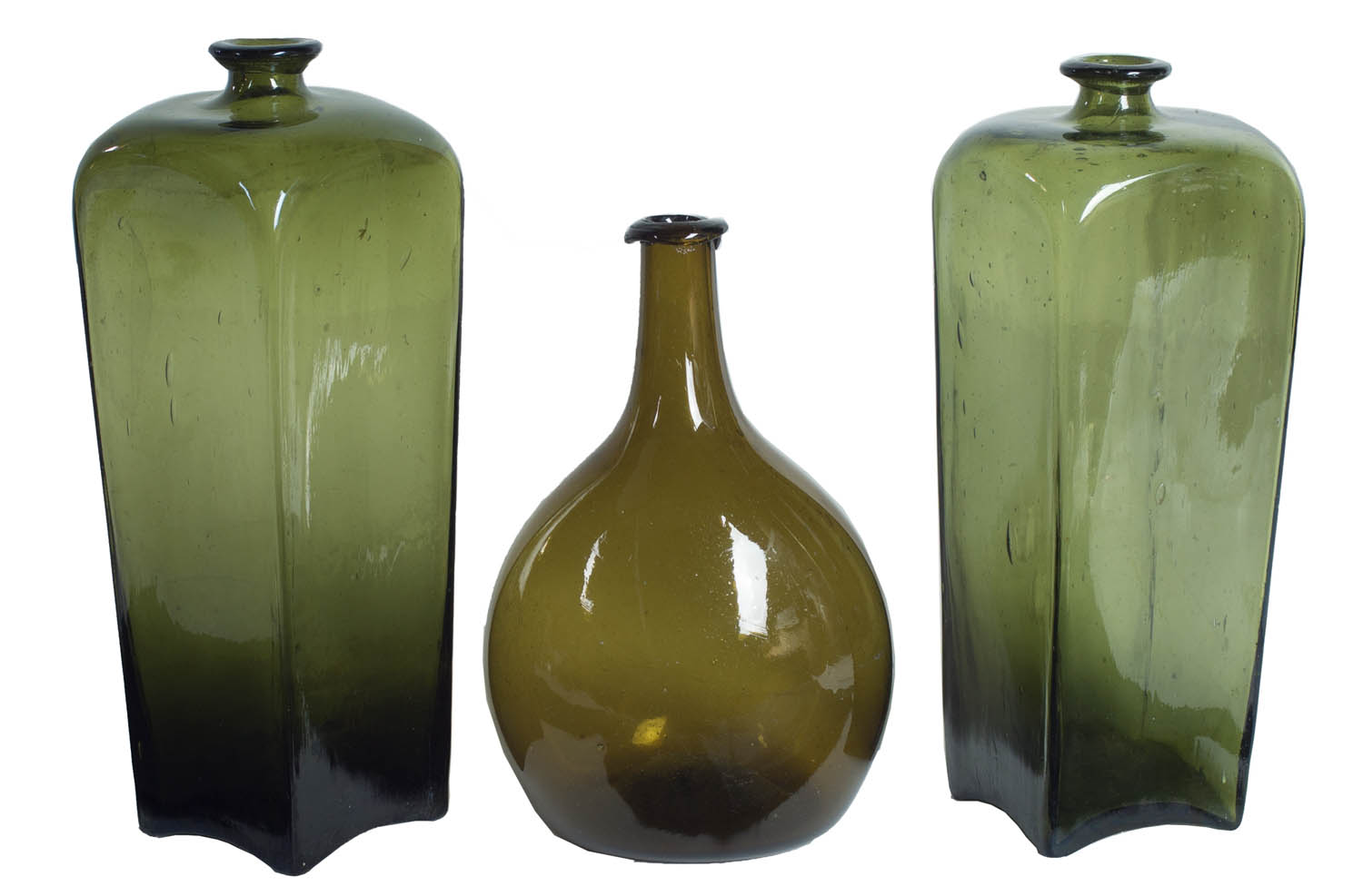 Two cased gin bottles, 10″ h, and a globular green bottle with blob lip, (small chip off underneath the lip), 8″ h.