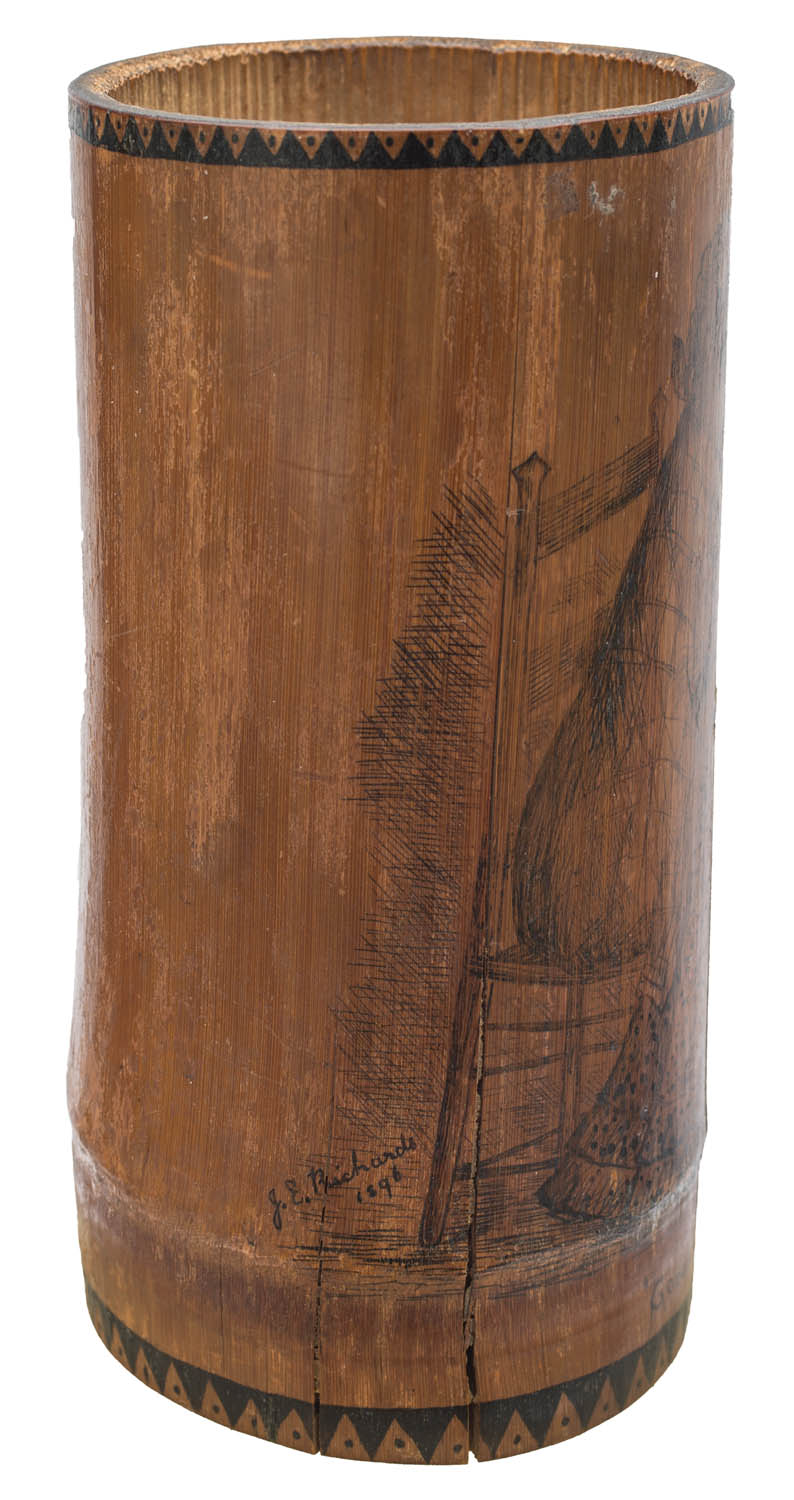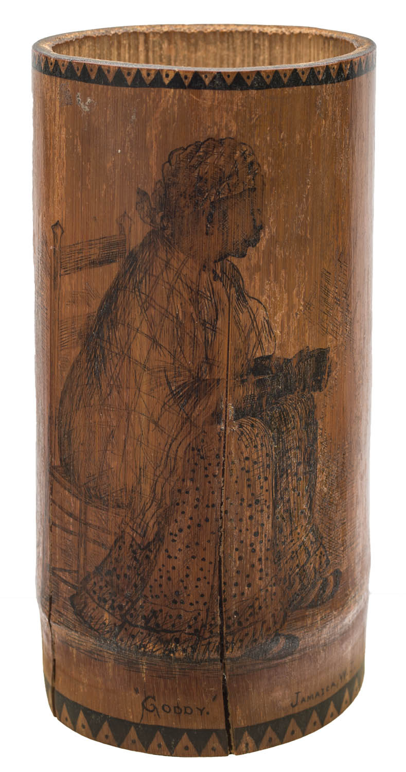 Cup with inked drawing of a seated woman “Goody.”, Jamaica W.I., artist signed “J.E. Richards, 1896”, (shows splits).
