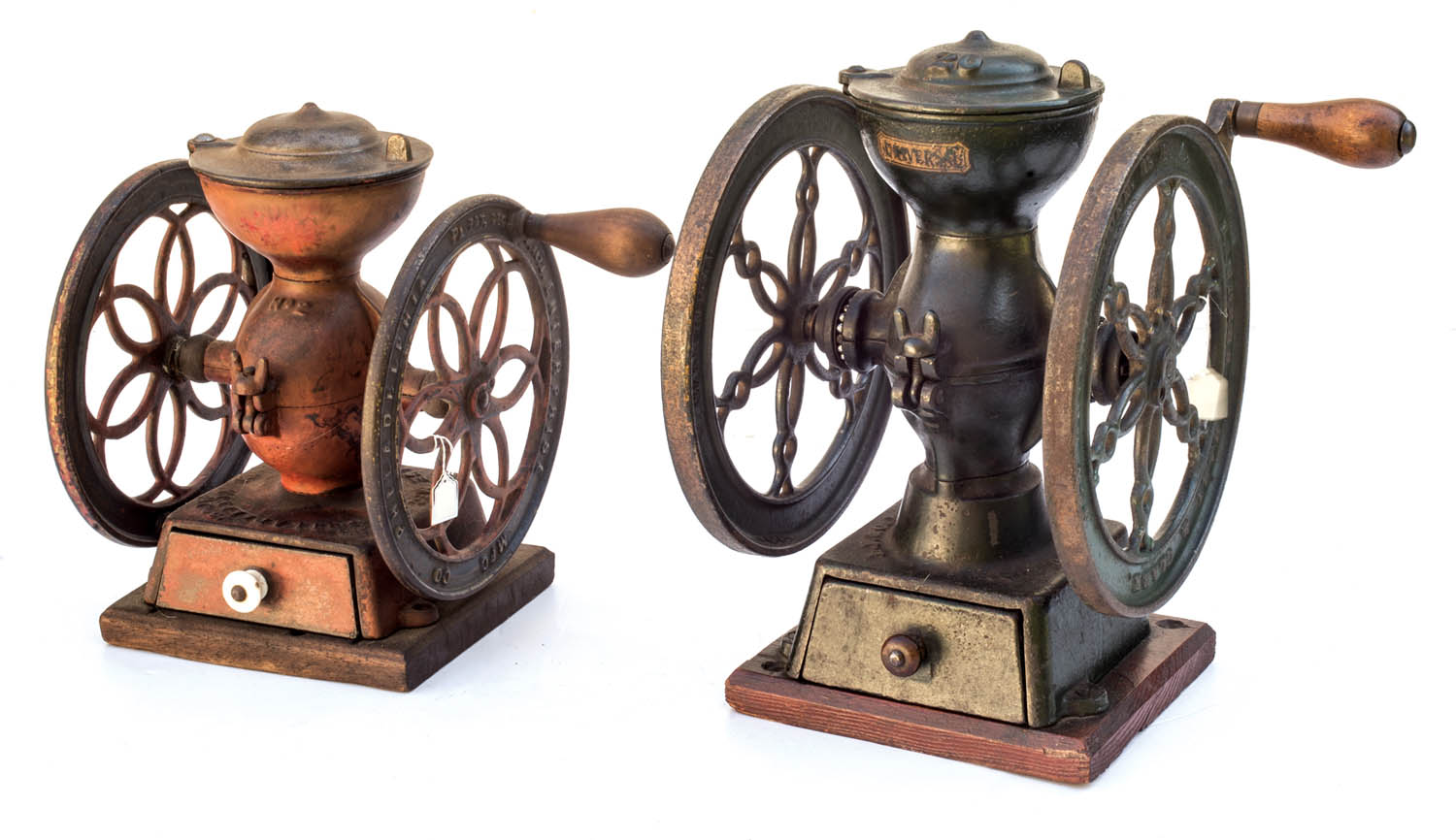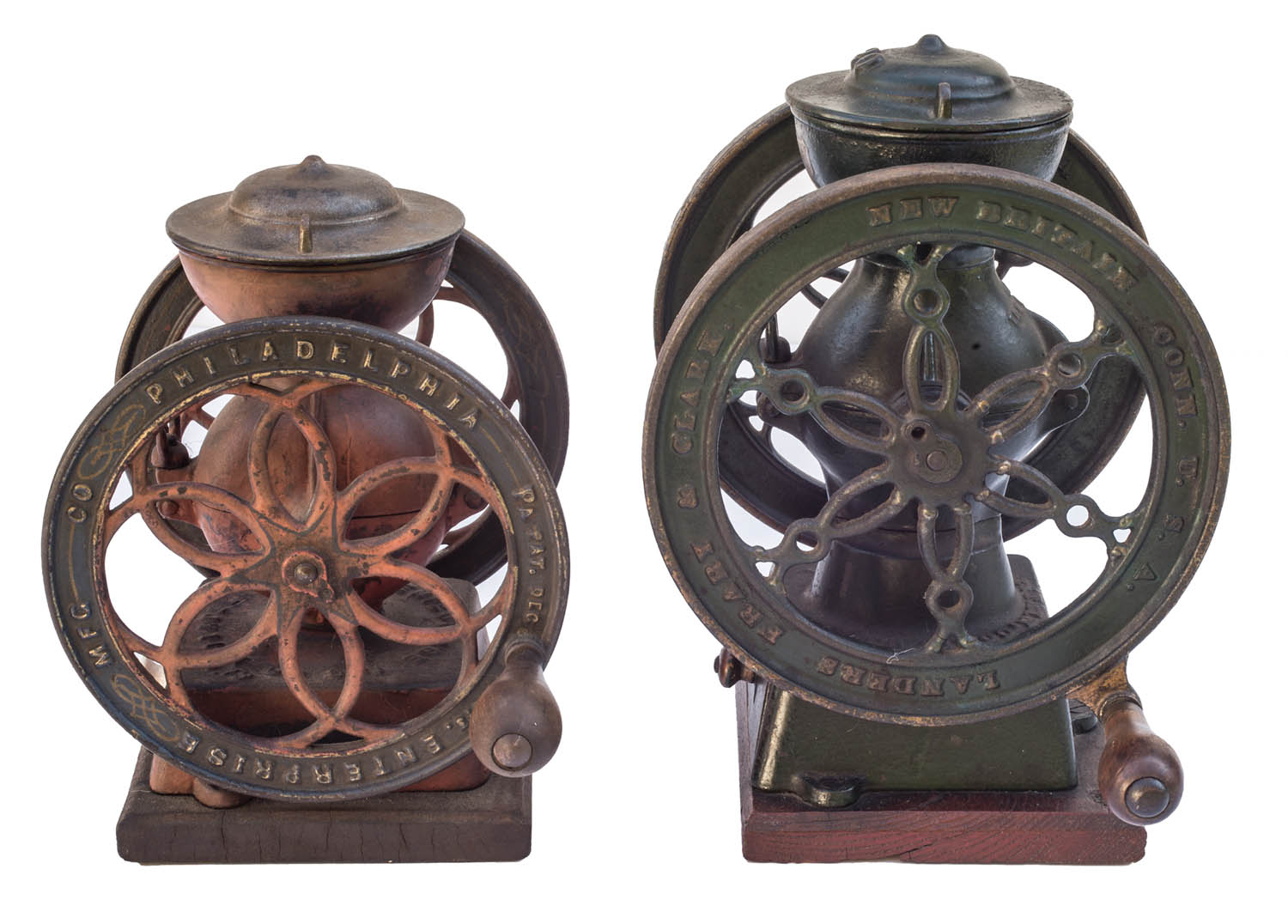 “LF&C Landers, Frary and Clark”, cast metal, green and gold, 12″ h, 8″ w, 8 1/2″ dia (wheels); “Enterprise Mfg. Co., Philadelphia, U.S.A.”, cast iron, 1873, red and gold, 10″ h, 7″ w, 7 1/2″ dia (wheels).