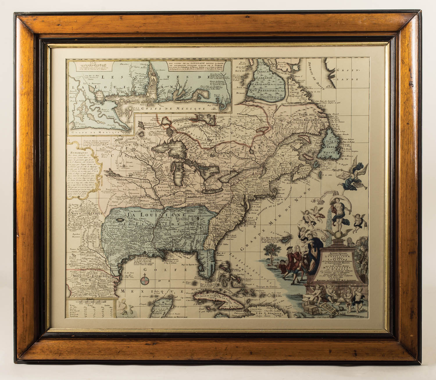 Hand colored, showing the Eastern part of North America, including the Louisiana and Florida Territory, c. 1740, large satirical title cartouche of the Mississippi Bubble investment scheme, carved maple frame, 17″ x 20″ (sight).