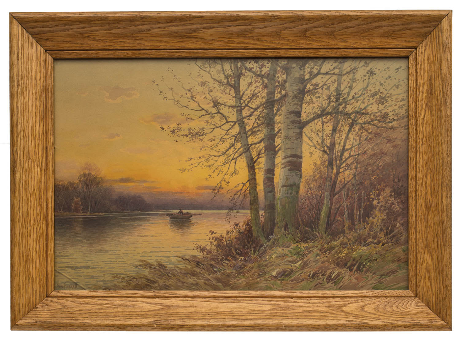 Watercolor on paper, water scene at sunset, with figure in a boat, and birch trees in foreground, signed l.l. “Wm. Paskell”, (small crack in glass lower left), 16″ x 24″ (sight).