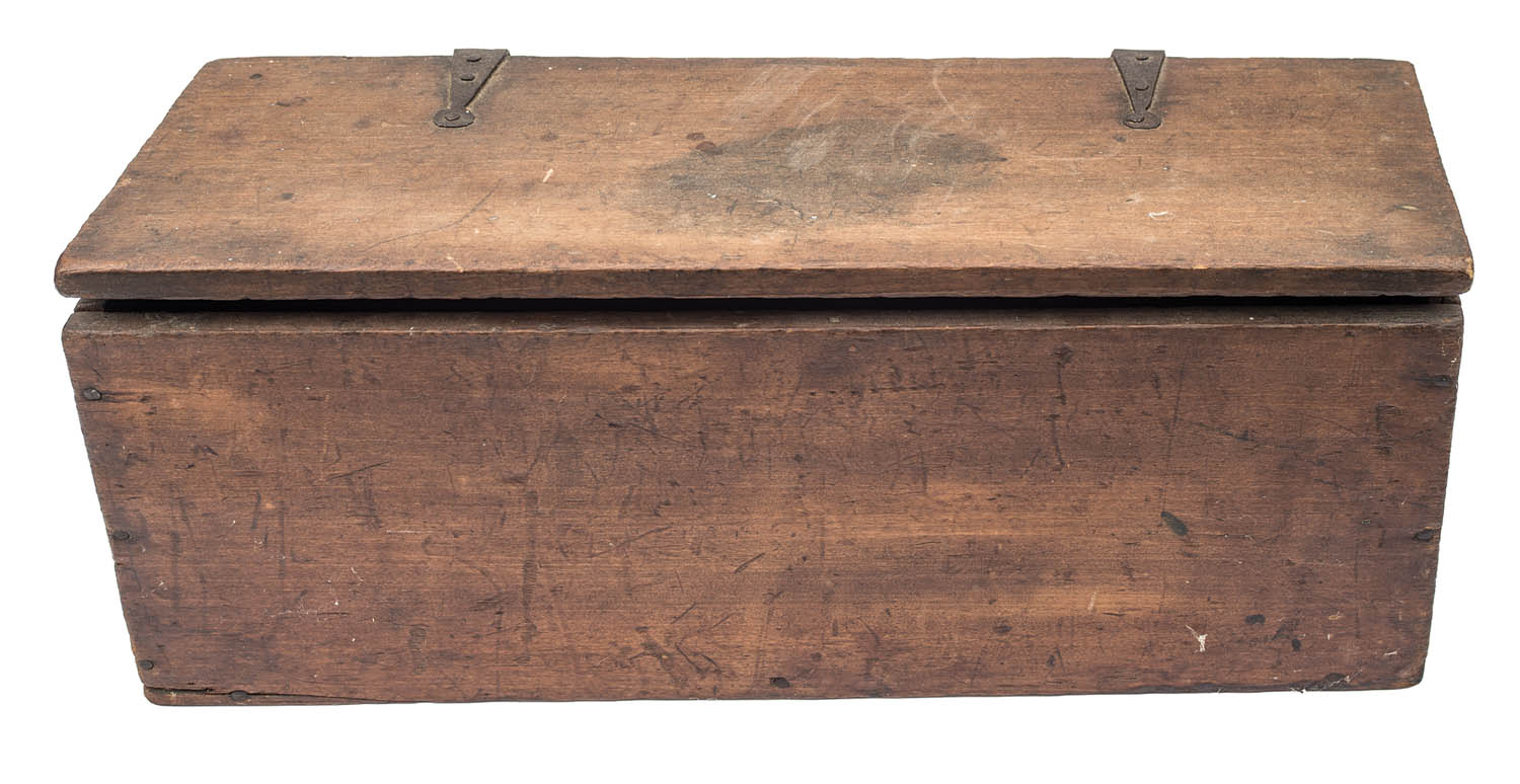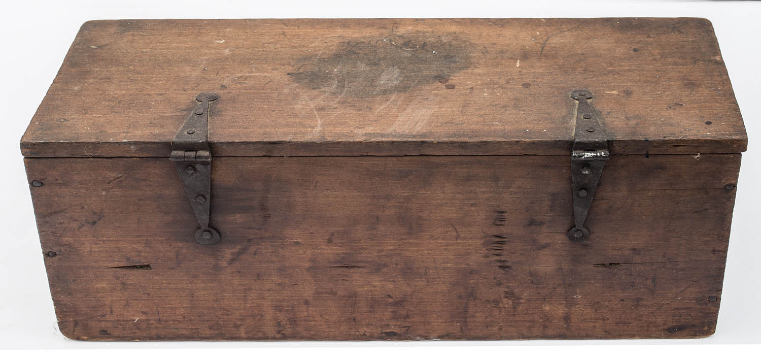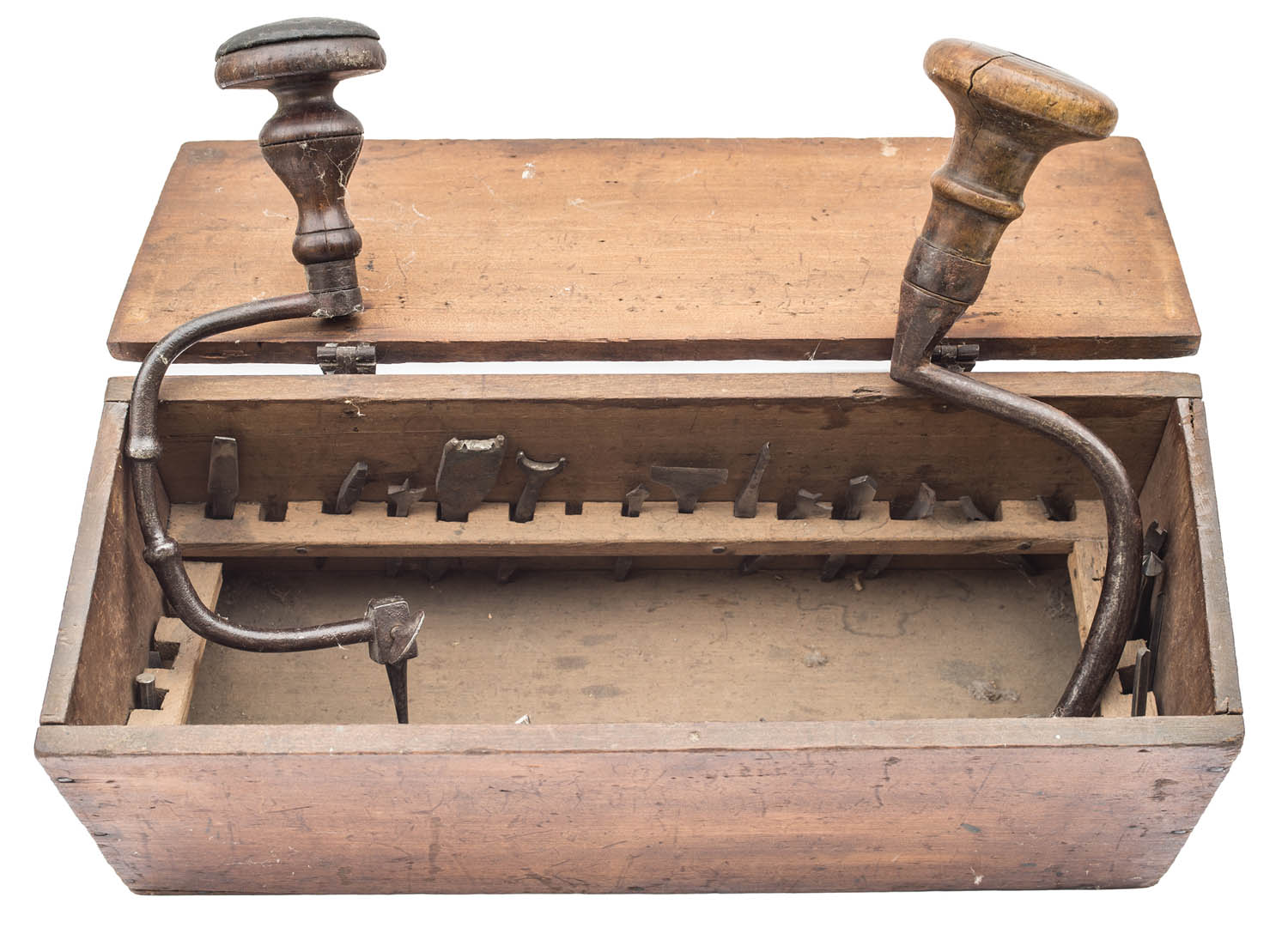 Fitted with two iron and wood drills, and approximately 40 different bits (some marked “Ridge”), strap hinges.