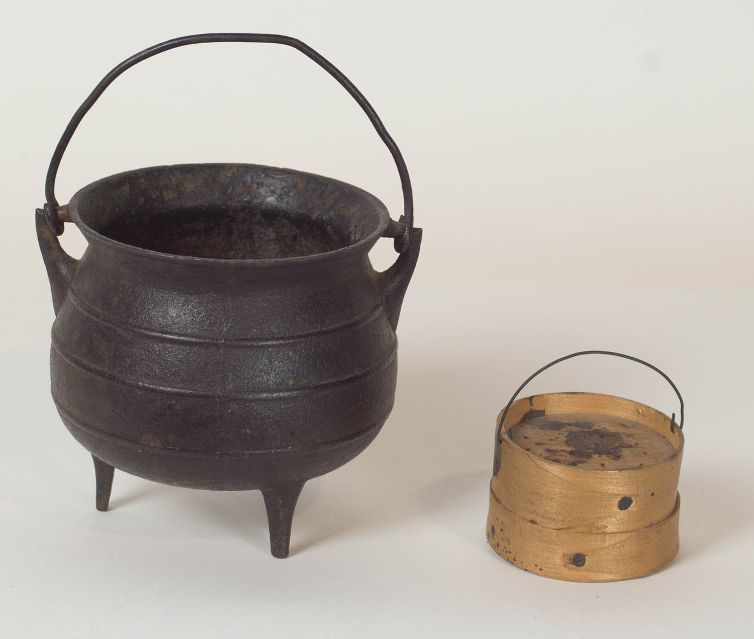Cast iron trifooted pot, ribbed with swing handle, 3 1/2″ h, 3″ dia; 19th c. rare wood sander, made in the style of a small round Hingham box, with wire swing handle, ink stains, 1 1/4″ h, 1 3/4″ dia.