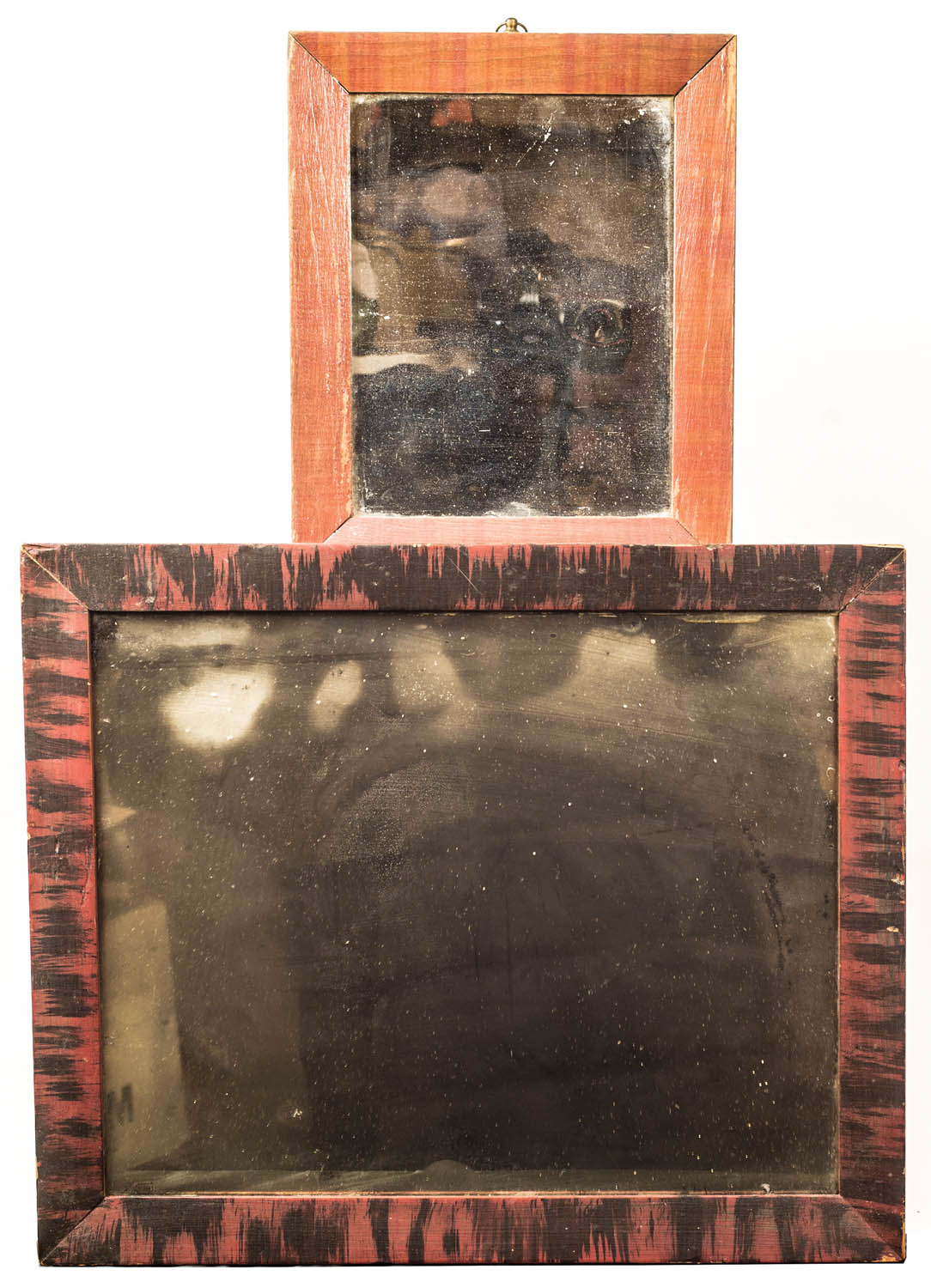 Pine frames, grain painted, black on red, 17″ x 14″, and smaller mirror, red on light orange, 11″ x 9″.