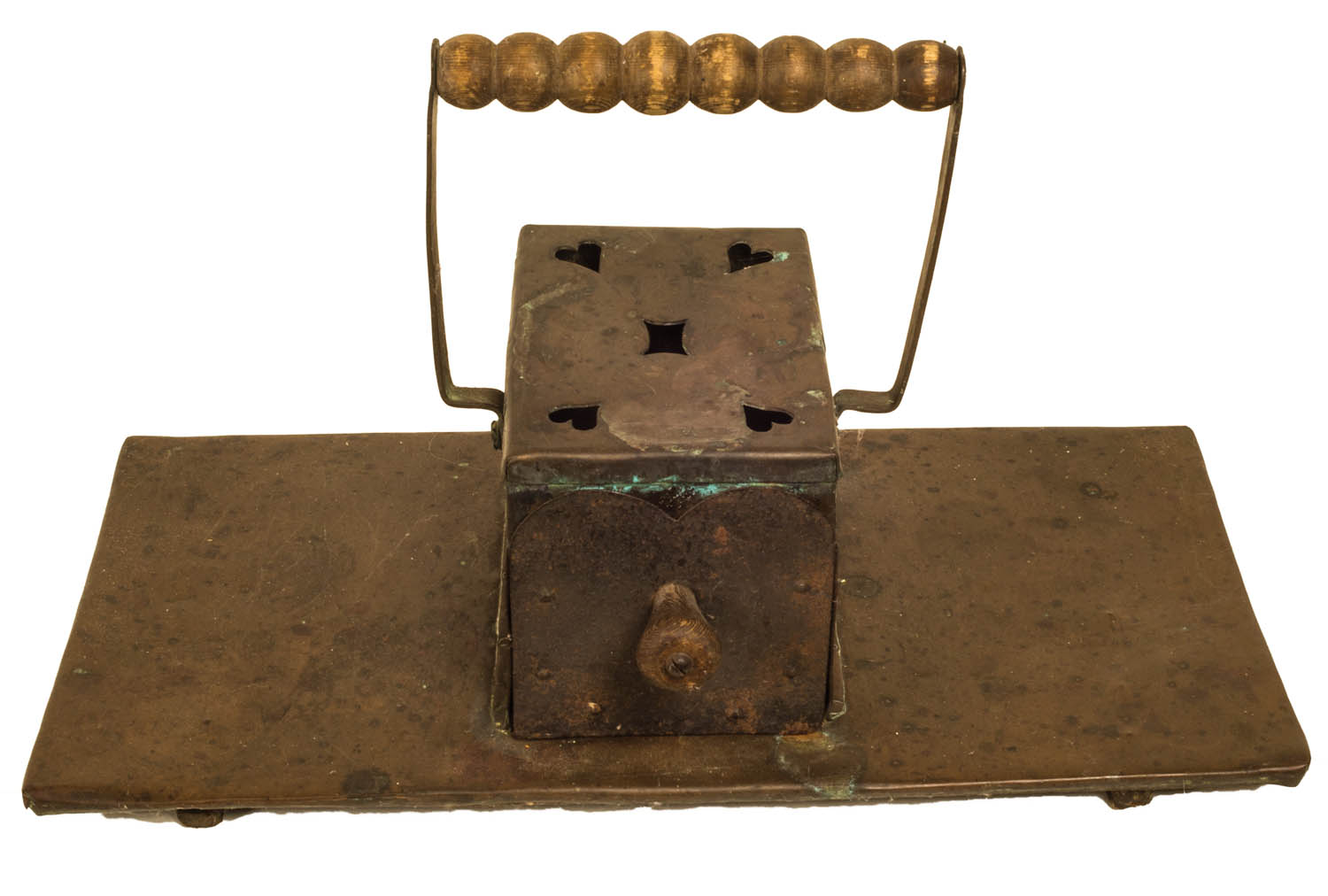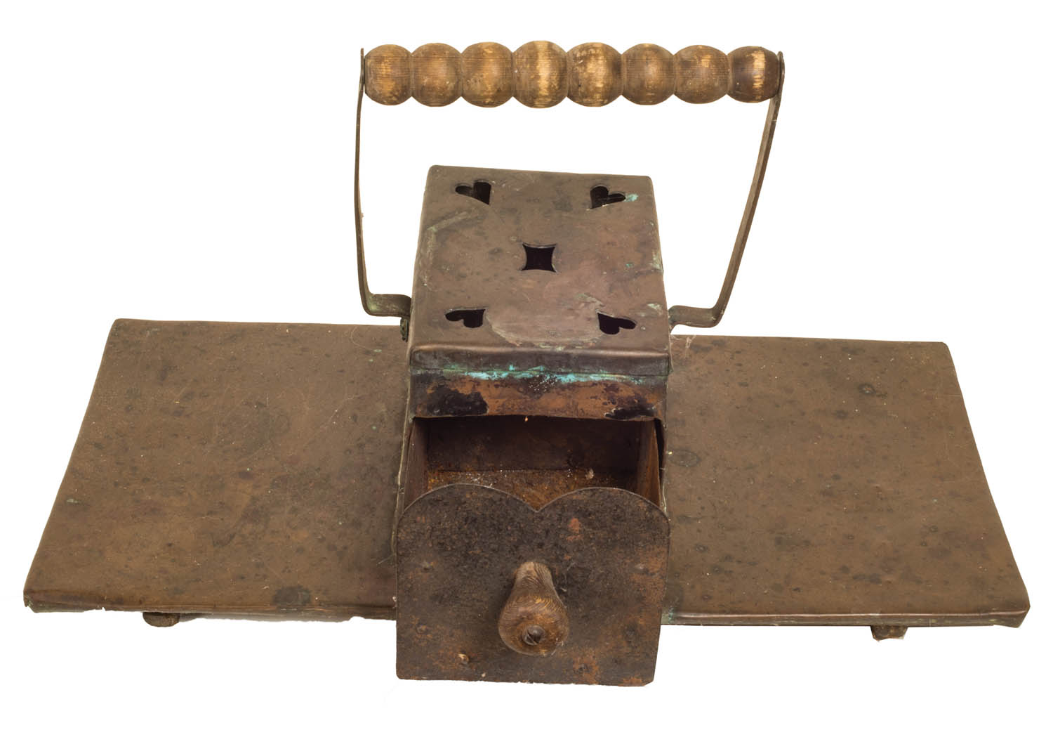 Sausage turned wood handle, cutout top with hearts in corners, pullout drawer for hot coals with turned wood pull, 6″ h, 19″ l, 10″ d.
