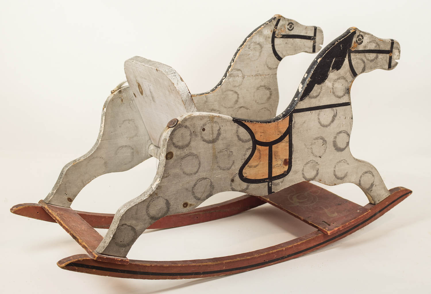 Early 1900, pine, in original paint, dapple gray with red and black, red rockers, 18″ h, 31″ l, 12″ w.