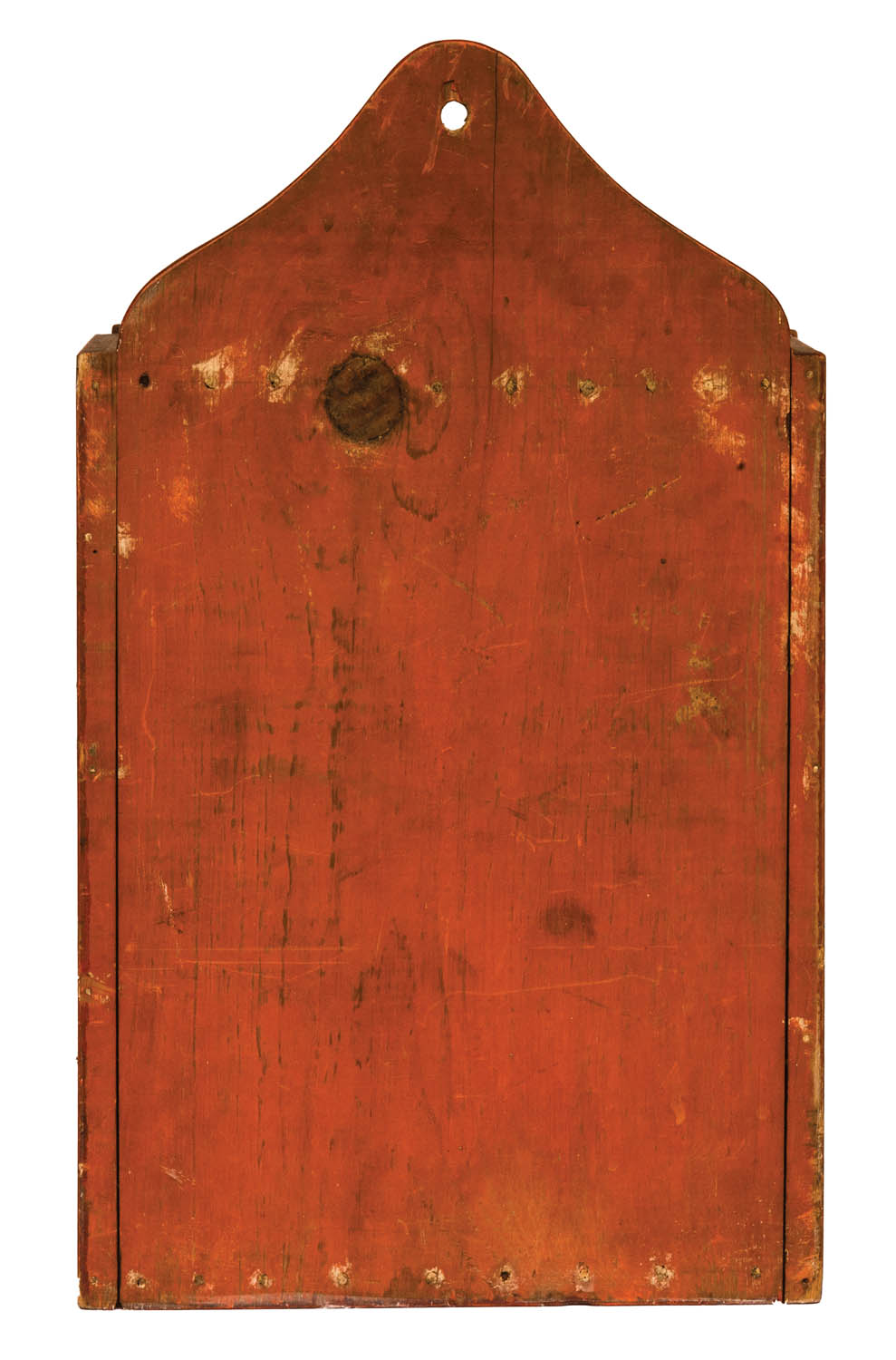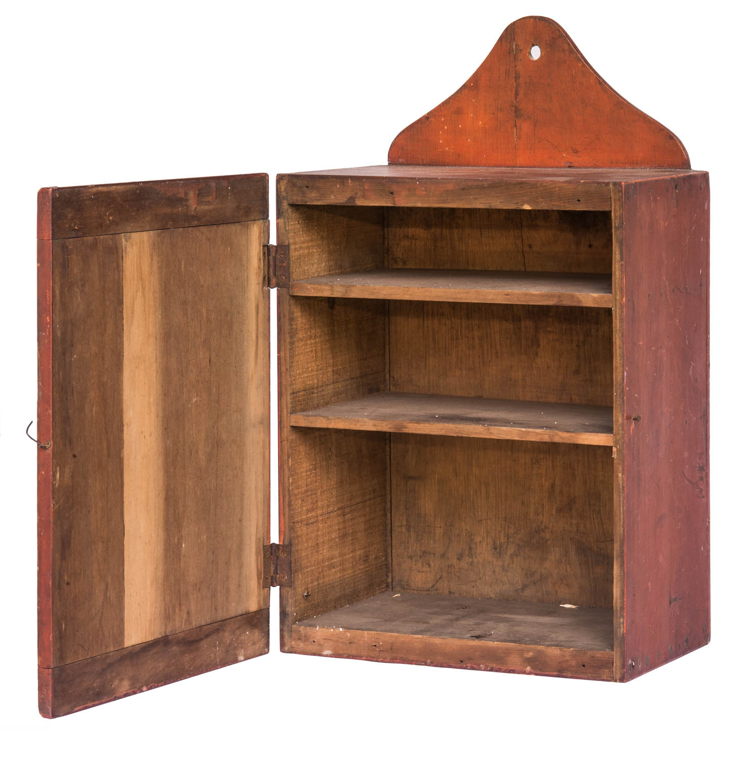 Poplar and pine, in original orange/bittersweet red, hinged breadboarded door, extended arched backboard, with hole for hanging, (note: “Fleishman & Co.” can be seen under the paint on both sides), three-shelf interior, 14″ h (case), 18″ overall h, 10 1/2″ w, 7″ d.