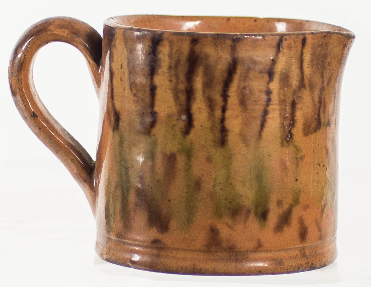 Handled pitcher, straight sided, orange with brown and green, spout, possibly Pennsylvania origin, (ex. Curry collection).