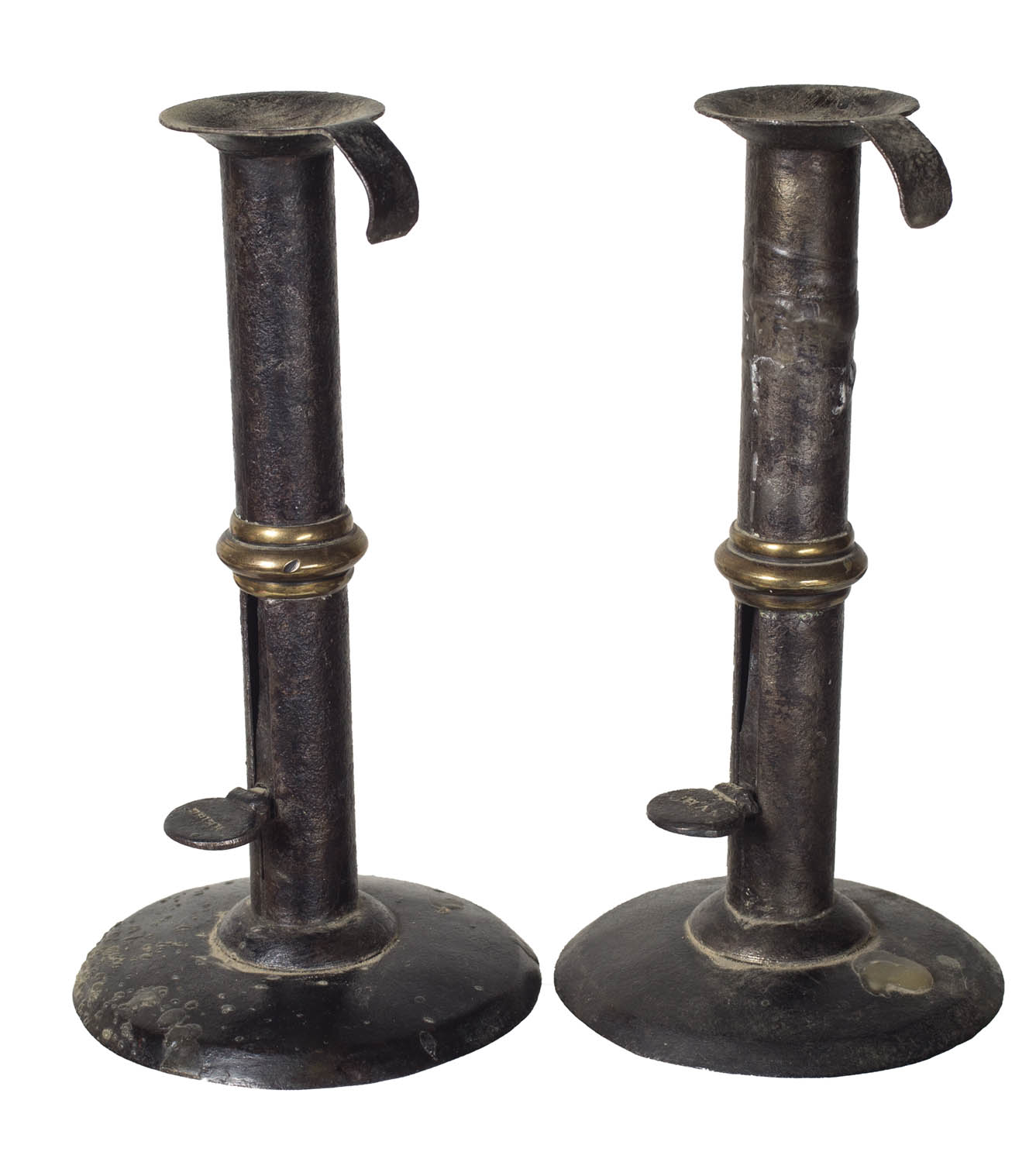 Pair of brass wedding ring hogscrape candlesticks, both signed “Han” and “Heke”, 7 1/2″ h.