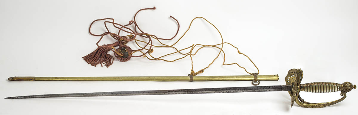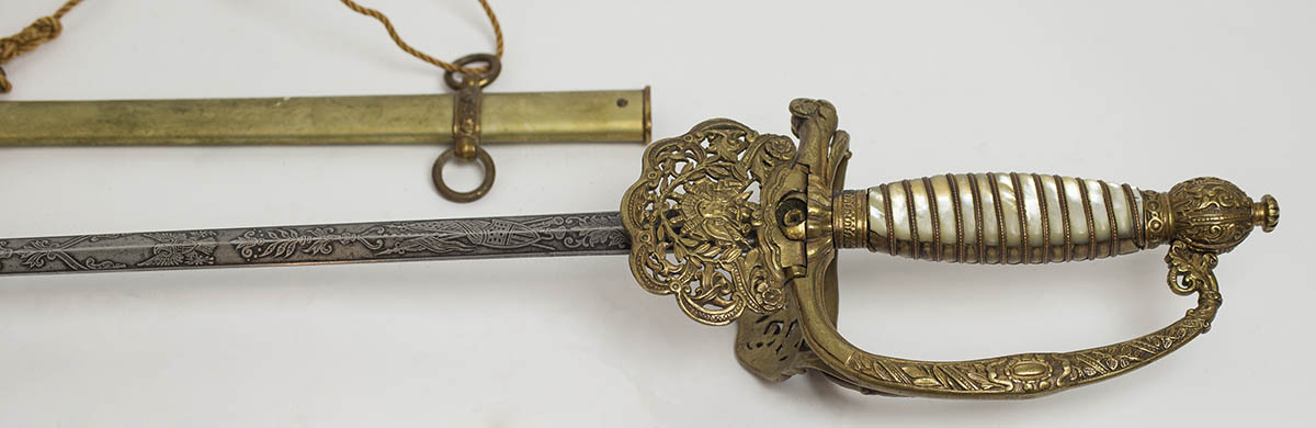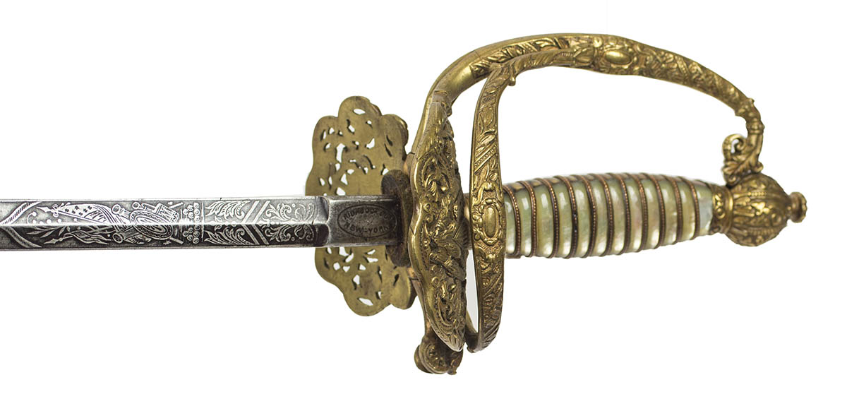 Fine “Ridabock & Co., New York” sword, made in France, with an etched blade “eagle with shield and flag with cannons motifs”, the cast brass guards exhibit the same two motifs, with a mother-of-pearl grip, 37 1/2″ l.
