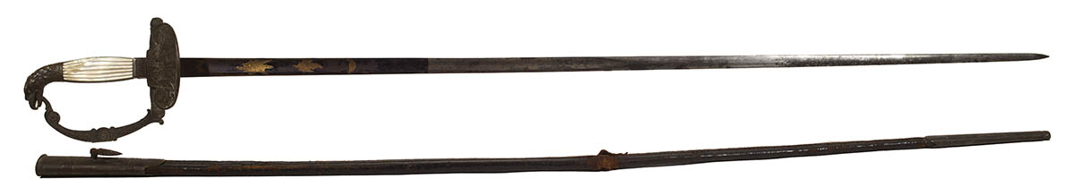 Eagle head pommel, mother-of-pearl inset grip, brass hilt, guard has eagle with shield, and lady liberty with shield, blade is partially decorated with blue and gold, leather scabbard is in two parts, with wear, 36 3/4″ l.