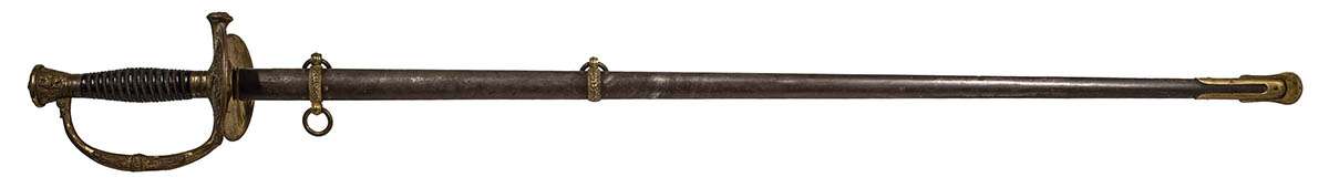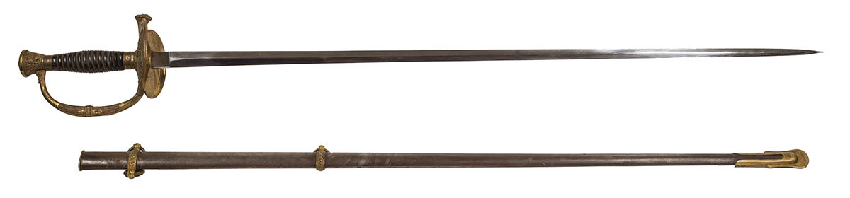 Straight sword with “F (a lightly engraved helmet, and a) D” on the base of the blade, the brass guard has an “eagle with shield” motif as does the pommel, scabbard has surface wear, 36″ l.