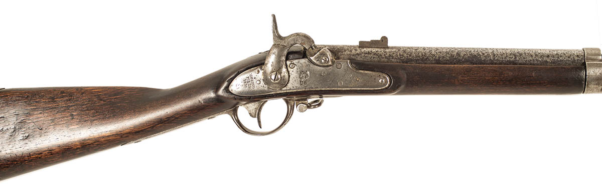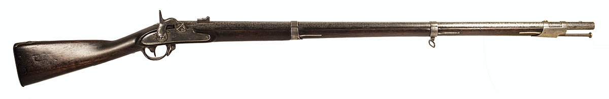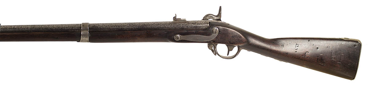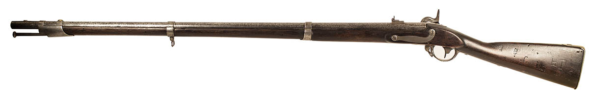 Originally a flint gun, converted in Philadelphia in 1861, Hughes & Phillips, New Jersey, “Springfield, 1831, (eagle with shield), US”, stamped marks “1861, H&P, NJ, S, US, SD, D”, initials etched in stock, 57 1/2″ l.