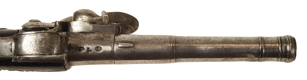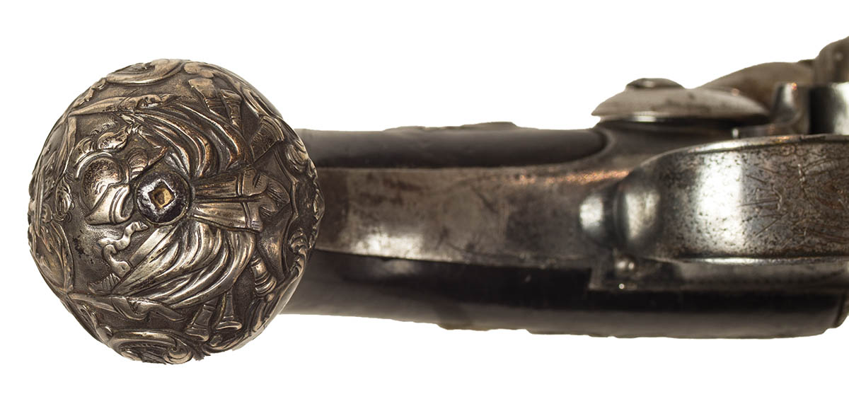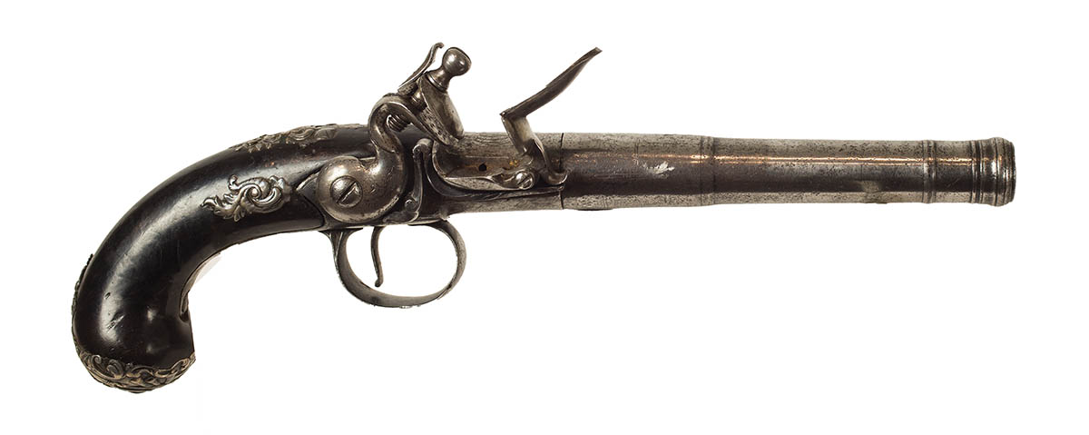 Single shot flintlock pistol, raised nickel silver decorative engraving, (Queen Anne pistol, exact gun illustrated in George C. Neumann’s book, Battle Weapons of the American Revolution, p. 241), hallmarked “RW”, 12″ l, (Provenance: George C. Neumann; Fred Fontaine; Dr. David Wolfe). [Includes a copy of a letter dated 8/4/2001 stating that this British “Queen Anne” pistol was made by Richard Wilson, and bears “The London Gunmakers Company Proof, Plus Wilson’s Stamp”, and “has been part of my personal collection”, “signed by George C. Neumann”.]