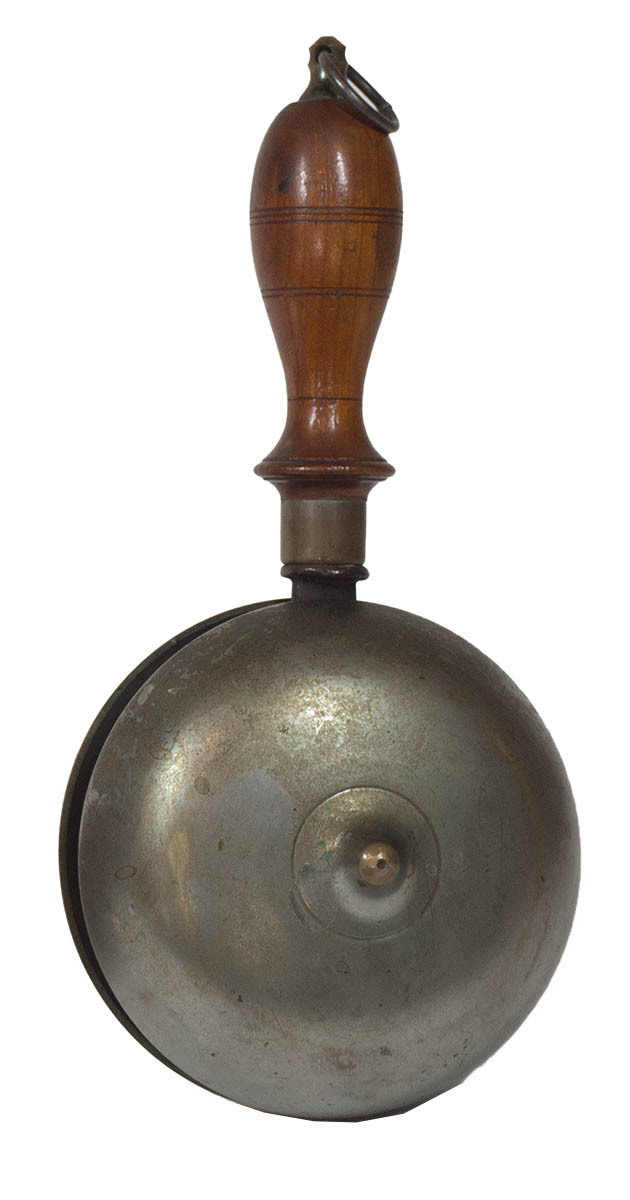 Nickel plated brass camp dinner bell or gong, (also used by fire brigades), hand held with a wooden handle, minor wear, 10 1/4″ l.