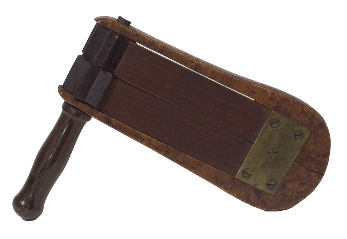 Wooden spinning noisemaker, clacker, or ratchet, nice bird’s-eye maple frame, with wear, age crack on one side of end, 9 1/4″ l.