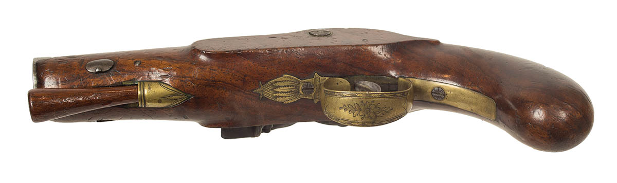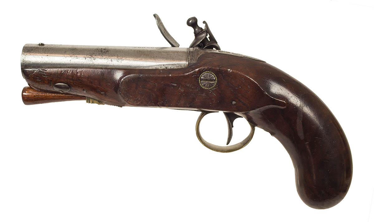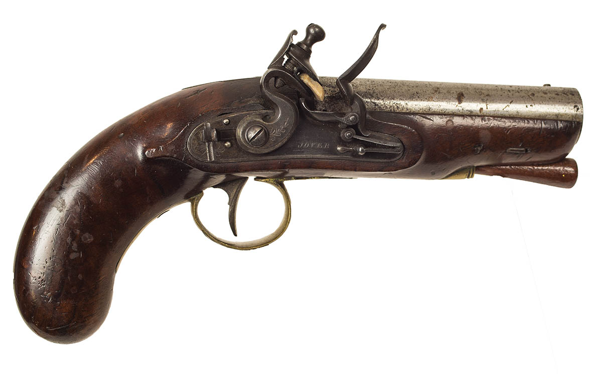 Single shot pistol, lock plate signed “Jover”, barrel marked “London”, c. 1800-1812, non-functioning, 35% original finish, 8″ l.