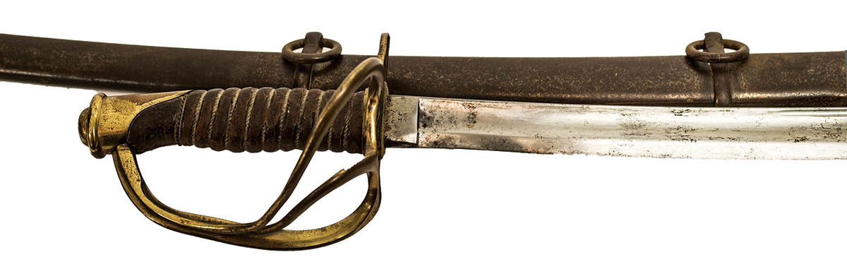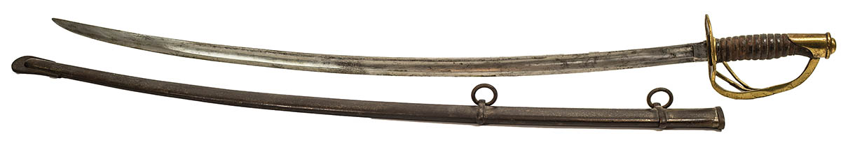 Cavalry saber, stamped on the blade “US, J.T., 1860” and “JH” on the pommel, good blade, wire wrap is missing, includes a scabbard, 41″ l.