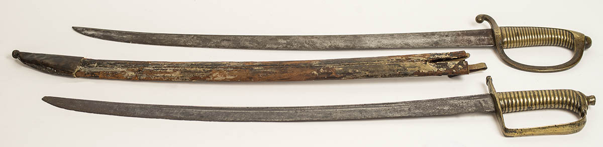 Two swords, one with wear, 28″ l, the other with a partial “shield with stars” stamp in the blade, and “1122” stamped on the edge of the guard, with a worn leather sheath, (foreign made, possibly Austrian), 29 1/2″ l.